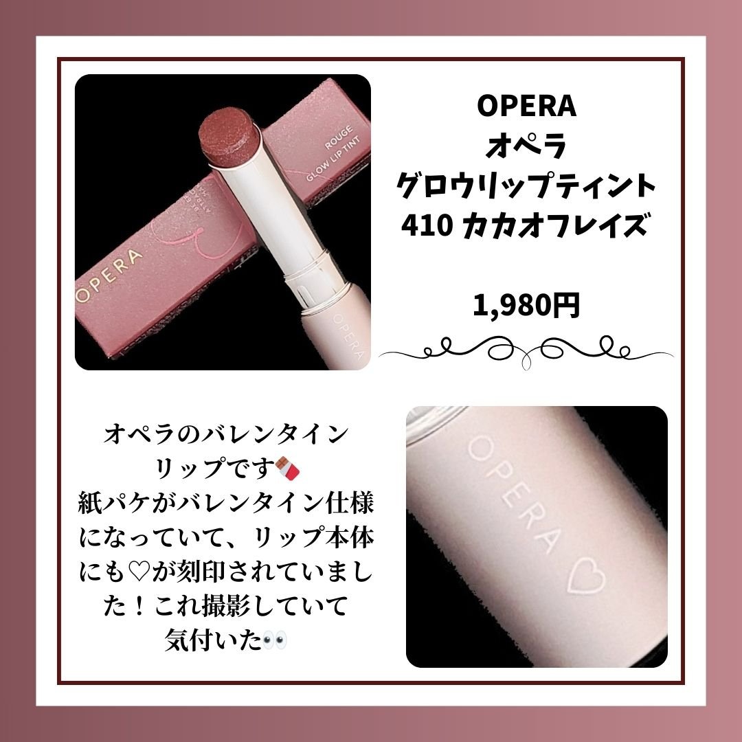 .オペラのティントのバレンタイン限定色410カカオフレイズはピンクラメが入ったチョコレートブラウン🍫🍓フリーズドライのいちごが散りばめられたチョコみたいでかわいすぎませんか…!オペラのリップってかわいらしい感じの色が多いイメージだったけどこれ...