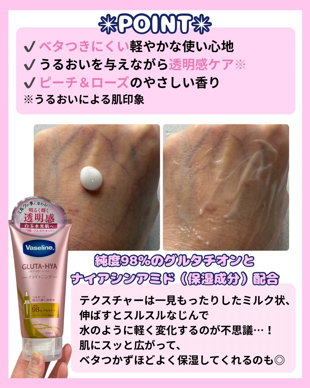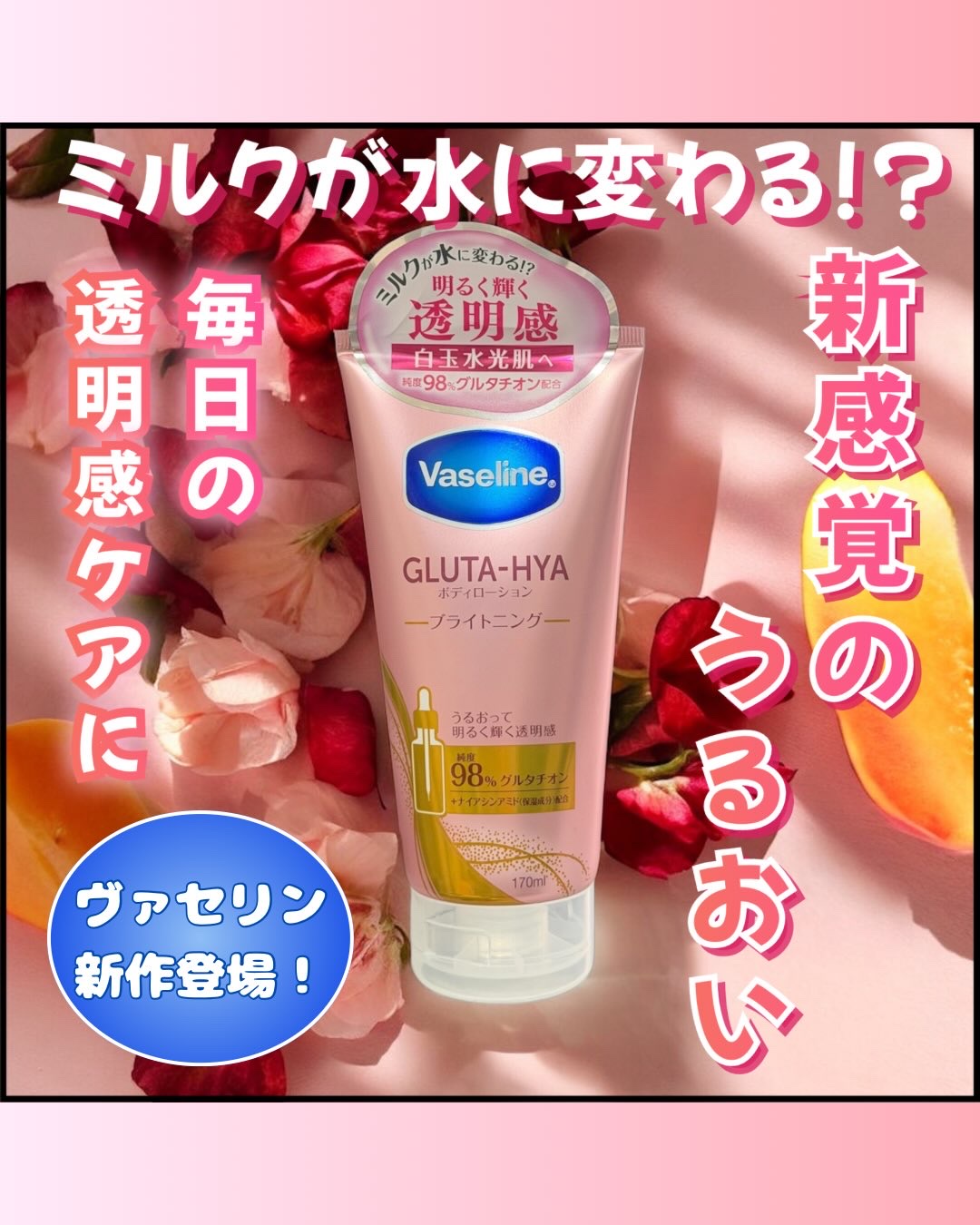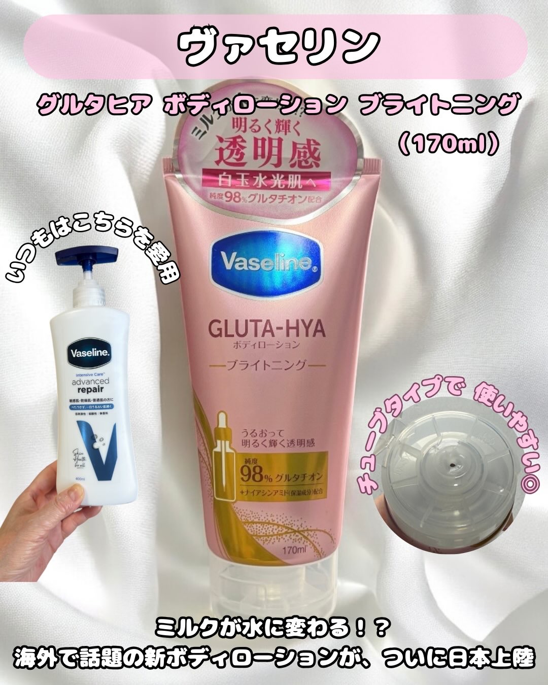 ヴァセリングルタヒアボディローションブライトニング170mlPoint1♡ベタつかないボディーローションPoint2♡べたつかない&うるおって透明感ケアPoint3♡ピーチ&ローズの香り海外で話題の新ボディーローションですミルクのような質感が...