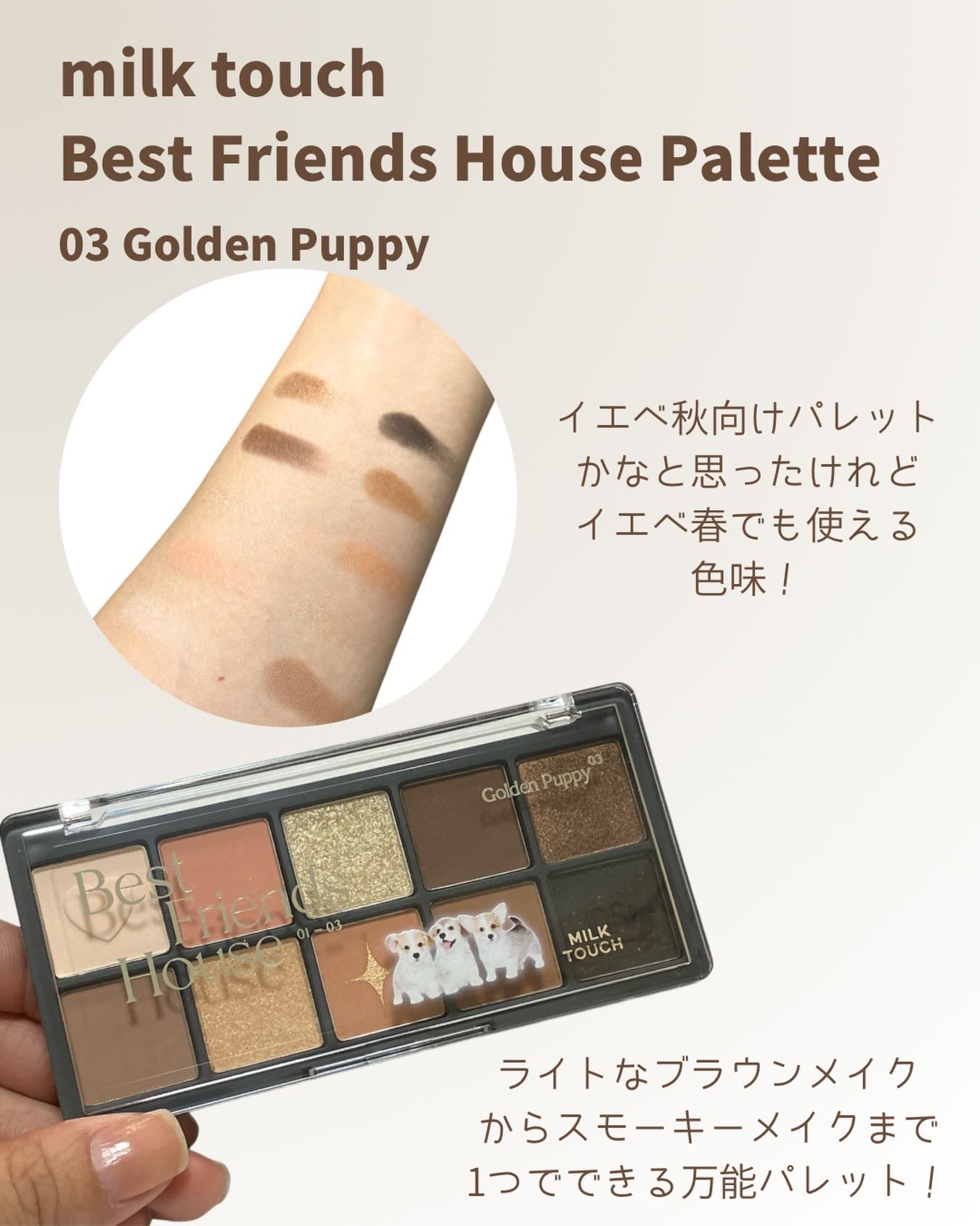 𓂃◌𓈒𓐍MILKTOUCHBestFriendsHouse01~03GoldenPuppy03名前からしてかわいいアイシャドウ🐶今回はイエベ春カラーを頂きました!使いやすいコーラルの色味もあれば万能のブラウン系もある贅沢10色パレットそれぞれ...