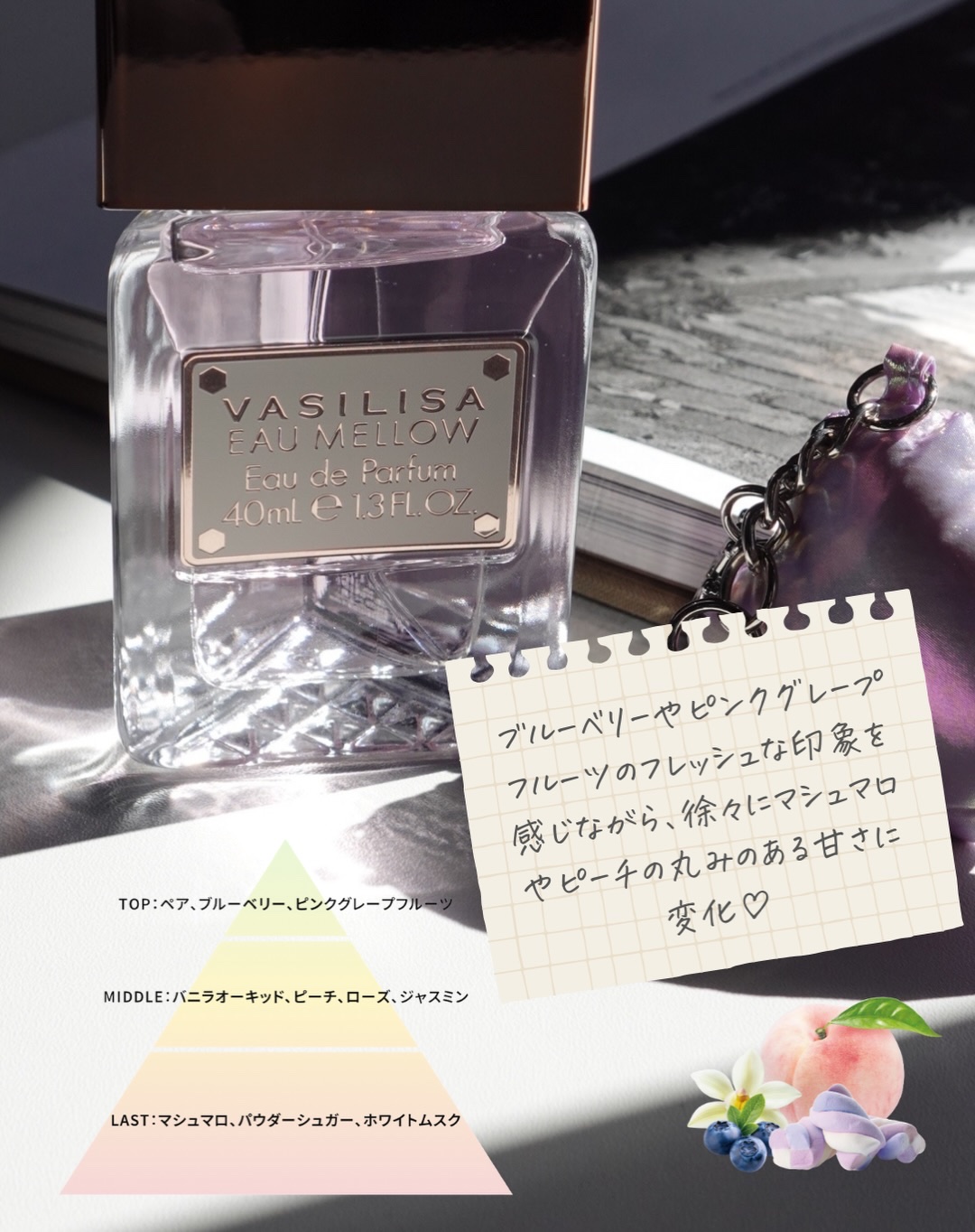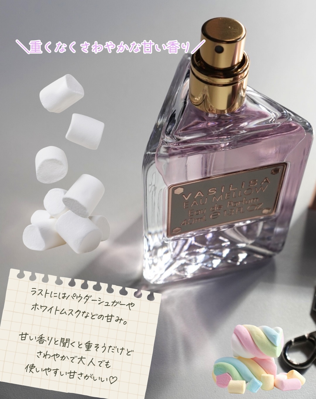 - 軽やかなパープルに包まれ、まっすぐな眼差しで“甘さと芯の強さ”を表現。 ふんわりマシュマロ香る新作「オー メロウ オードパルファム」が発売 キー香料は、ふんわり甘いマシュマロ。 ジューシーなピーチとブルーベリーに、バニラオーキッドがしなやかな芯を添えます。 フルーティな甘さがやわらかいマシュマロを感じさせる香りです。 ボトルデザインの基調となるのは、軽やかながらもどこか芯の強さや意思を感じさせるパープル。 「オー メロウ」のコンセプトである“内に秘めた、芯のある女性”を表現しています。 【初回数量限定パッケージ】 「オー メロウ」の発売を記念して、オリジナルチャーム付きの初回限定パッケージが登場。 パッケージには、雲のように浮かぶマシュマロを大胆にデザインしました。 付属のチャームは、キラキラとした雲型クッションに、VASILISA の刻印入り“女王の王冠”を添えた特別仕様です。 ※数量限定、なくなり次第終了 <40mL> 1月17日(土) 全国のバラエティショップ、ディスカウントストア等 オンラインストア「FITS you. STORE」 https://store.fits-japan.com/shop、楽天市場、Qoo10 等 <8mL> 1月17日(土) 全国のロフト、PLAZA、アインズ&トルペ(※一部店舗を除く) オンラインストア「FITS you. STORE」 https://store.fits-japan.com/shop 等 2月28日(土) 全国のバラエティショップ、ディスカウントストア等 一般発売に先立ち、1月7日(水)より@cosmeTOKYO 特設売り場にて先行発売を行うほか、FITS ONLINE STORE 楽天市場店にて先行予約を開始いたします。