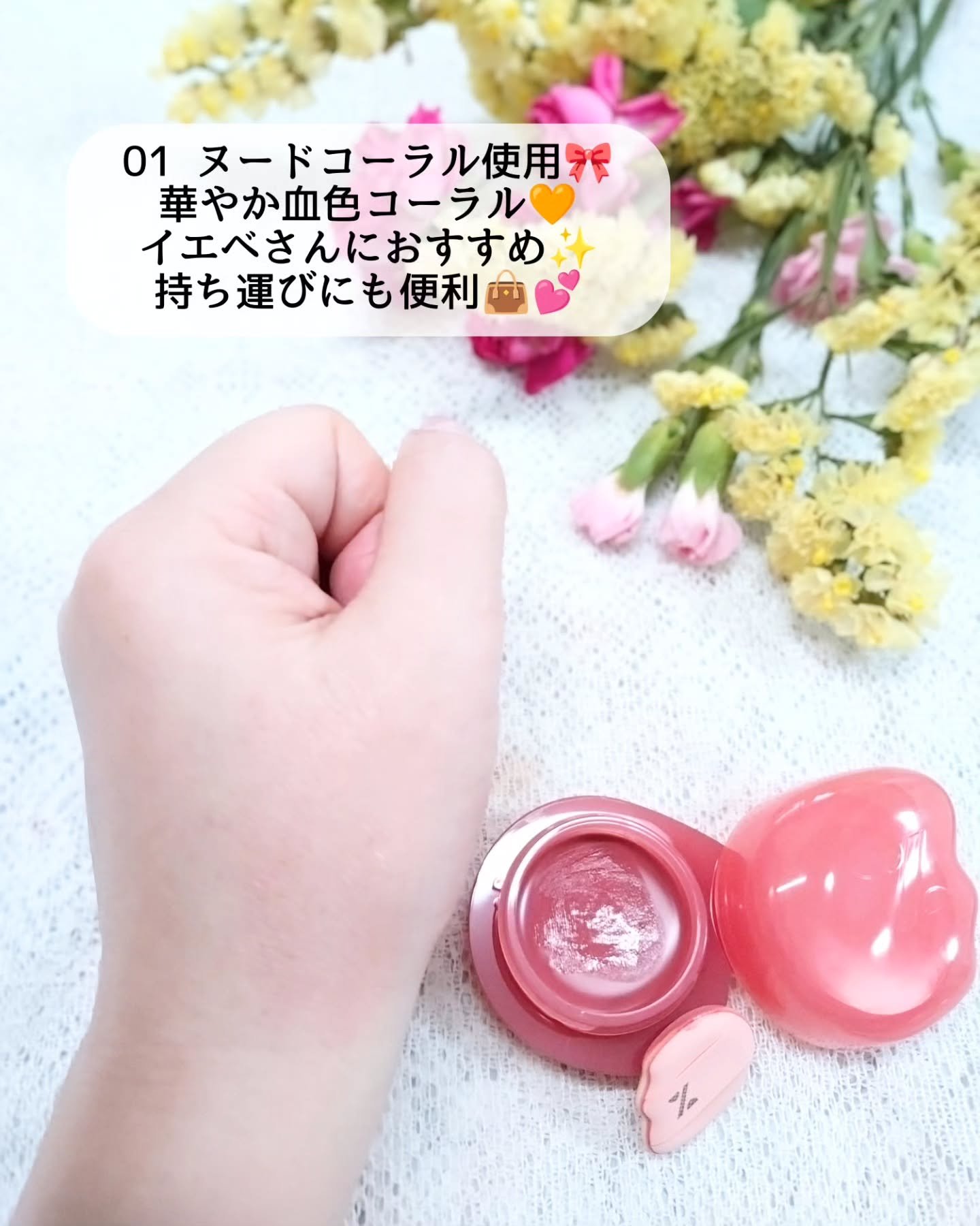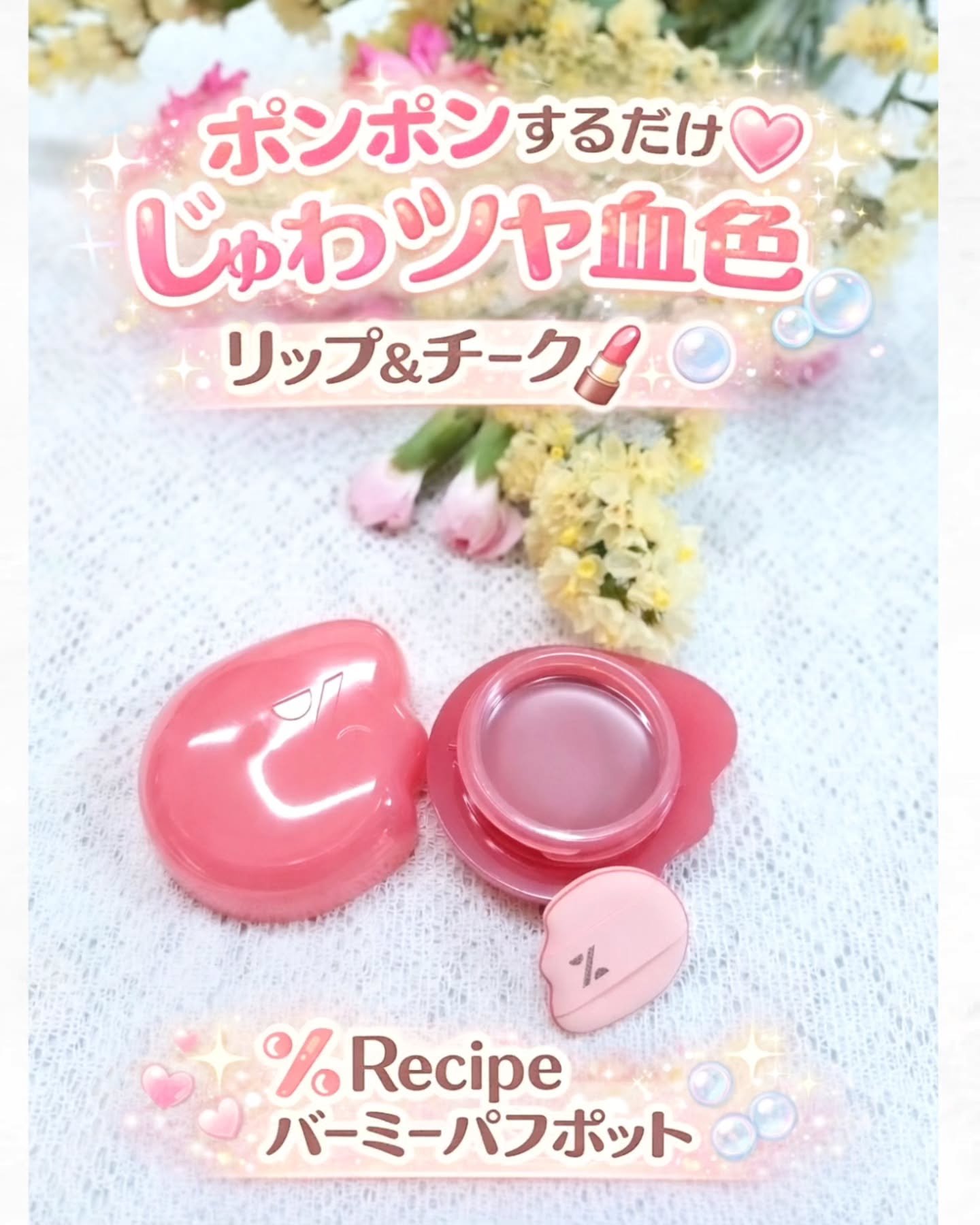 %Recipeより商品提供いただき使用しました%Recipe(パーセントレシピ)バーミーパフポットリップ&チーク2Way使用にちょうどよいじゅわツヤ血色感!色味は全5種類です!あたしは、01ヌードコーラル使用したよ!チークにもリップにも使える...