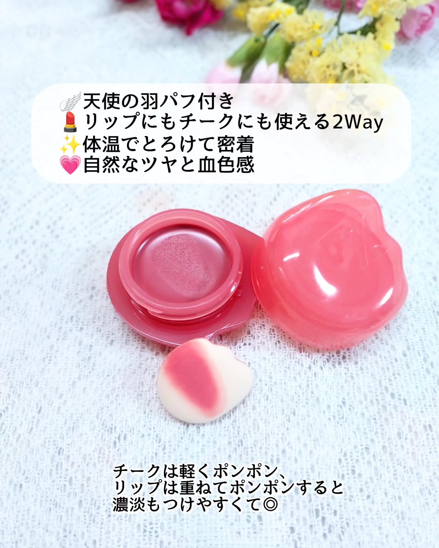 - チークにもリップにも使えるゼリーバーム。ポンポンとなじませるだけで、自然な血色感とツヤをプラス。 手を汚さず使える「専用指パフ」付きで、ケース内にすっきり収納可能。 パフをなくす心配もなく、外出先でもサッと使えて便利です。