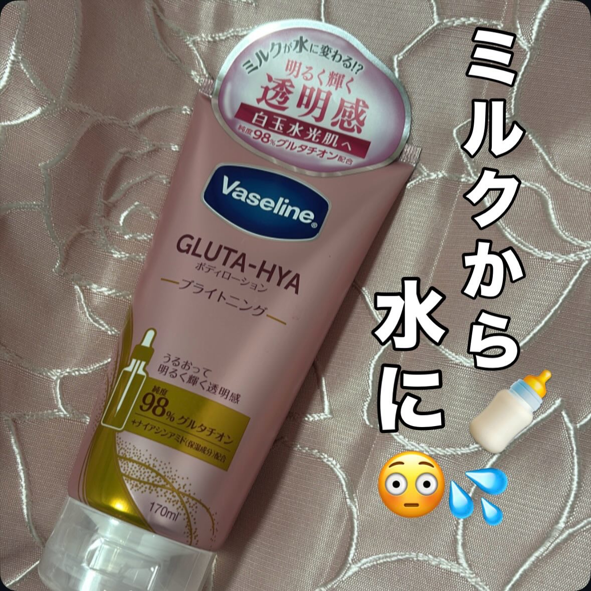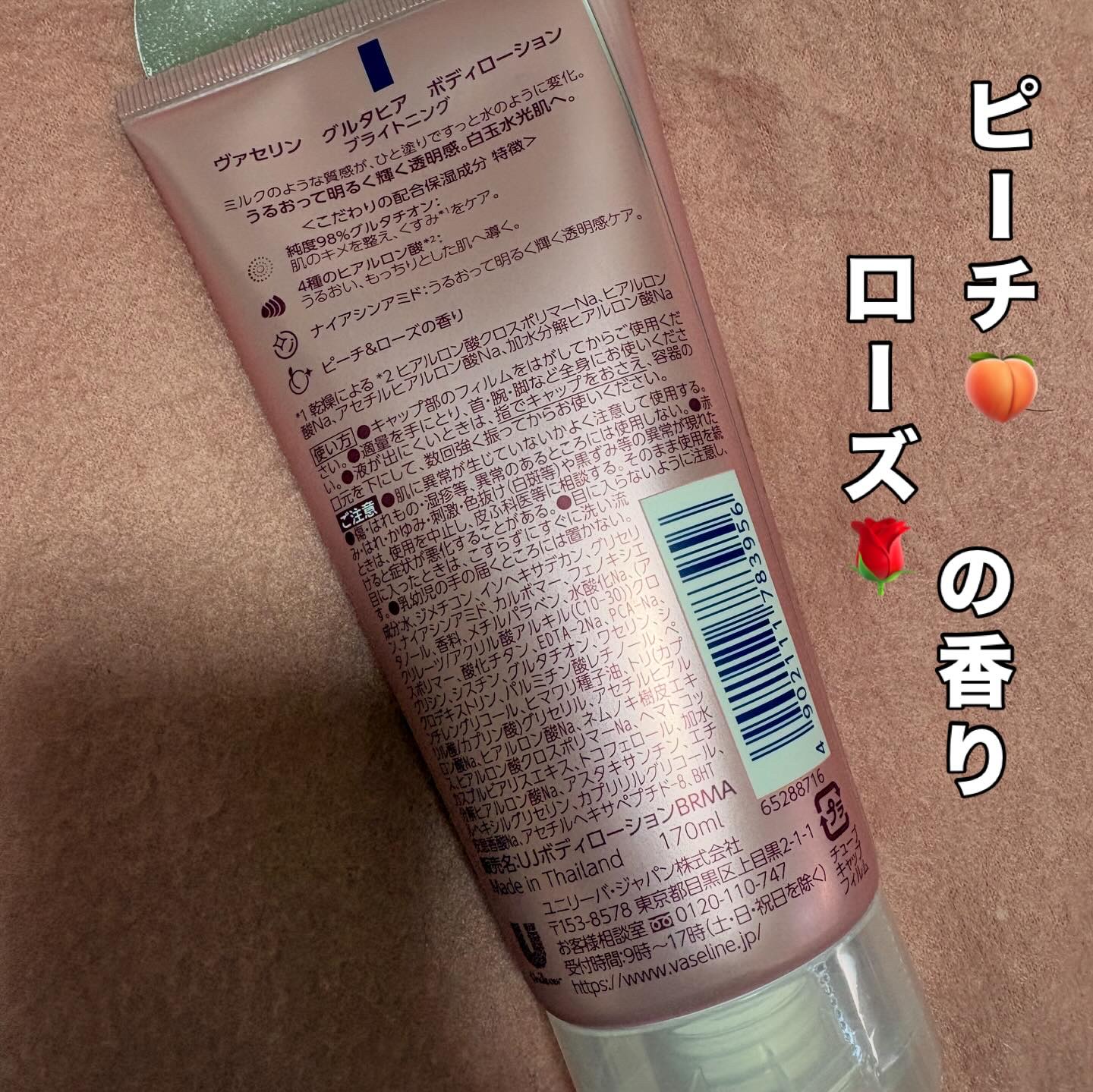 ヴァセリンGLUTA-HYA(グルタヒア)ボディローション ブライトニング純度98%グルタチオン配合のボディローションジェルクリームのようなテクスチャー手に取り出した時はボディローションよりボディ乳液に近い印象でしたでも伸ばしてみる...