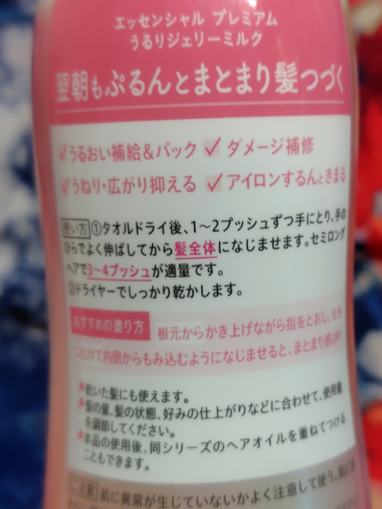 エッセンシャルプレミアムうるりジェリーミルク𓏸𓂂𓈒𓂃商品特徴𓂃𓈒𓂂𓏸うねり・広がる髪に。うるおい補給&パック。翌朝もぷるんとまとまり髪つづくジェリーミルク。〇うねり・広がり抑える〇紫外線・摩擦などによるダメージ補修〇ドライヤー速乾/...