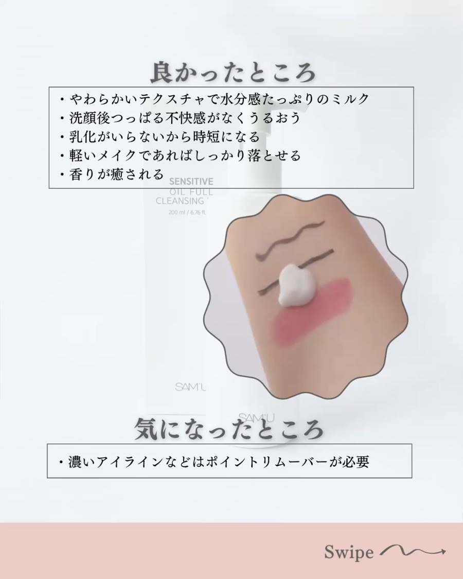 敏感肌さんの「落とすケア」に寄り添うサミュセンシティブオイルフルクレンジングミルクミルクのやさしさとオイルの洗浄力を両立した設計で、濃いメイクもするんとオフすでに乳化された処方だから、面倒な乳化ステップは不要ミルク状からオイル状へと変化するテ...
