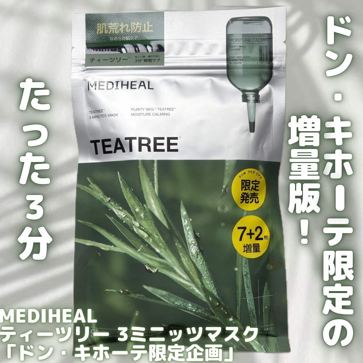 忙しい日の心強い味方🌿MEDIHEALティーツリー3ミニッツマスクドン・キホーテ限定の増量企画が登場。通常よりうれしい9枚入りで毎日使いしやすいのがポイント😎たった3分のケアでも肌にうるおいをしっかり届けてくれる使用感が魅力だよ❤️ティーツリ...