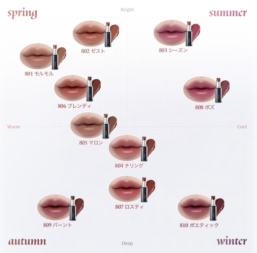 - □ 唇にぴたっと密着し、1日中鮮やかで上品なツヤリップ。 一度の塗布でしっかりと色づき、透け感のある光沢でぷるんとした立体感を演出します。 ベタつきのないなめらかなテクスチャーで、ナチュラルなのに印象的な唇に。 □ ひと塗りで決まる、クリアな高発色 何度も重ねる必要がなく、ワンタッチで鮮やかな色味がしっかりと発色。 唇の色に左右されず、ムラなくクリアに発色し、誰でも簡単に“美発色リップ”を実現できます。 □ 光に映えるツヤ感、肌なじみのよいカラーバリエーション ヌーディー・ミュート系を中心に、パーソナルカラーを問わず使える全10色展開。 派手すぎず上品なツヤで、シーンを選ばずにデイリーから特別な日まで幅広く楽しめます。 Loft、PLAZAの一部店舗にて、2025年10月11日(土)より先行販売、 Qoo10では10月27日(月)より販売をスタート