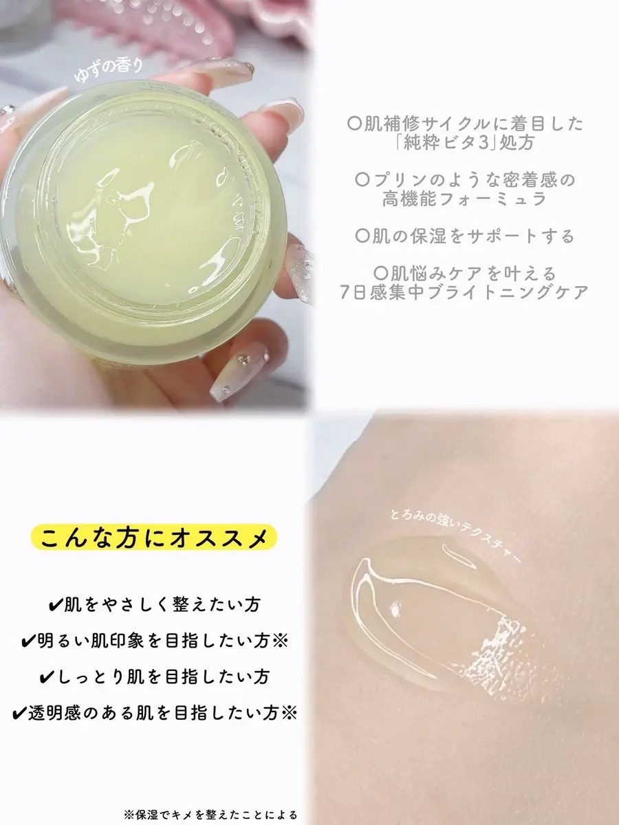 - ①輝くような肌印象へ導く、純粋ビタ処方 [遮断型ビタミンB3*] [明るい印象を保つビタミンB2*] [クリアビタミンC*] ②高純度×高密着 スリーピングケア ~Micro Pure C~ マイクロパウダー技術 イギリス産純粋ビタミンC*がベースに均一に溶け込んだ高純度フォーミュラ 合成着色料不使用、天然ユズの色そのまま。 乾燥くすみをケアする天然ユズ果皮オイル* 自然由来のやさしい色合いで、 肌に色残りすることなく使えます。 ③夜の集中ケアで肌印象すっきり ツボクサ3種*配合 マデカシン酸*:肌バリア保護 アジアチコ酸*:乾燥くすみケア アジアチコシド*:肌リズムサポート ぷるんとした濃密な”ぷるぷるプリン”テクスチャーが、夜のあいだ肌にしっかり密着し、もっちりとしたハリ感が続きます。 *保湿成分