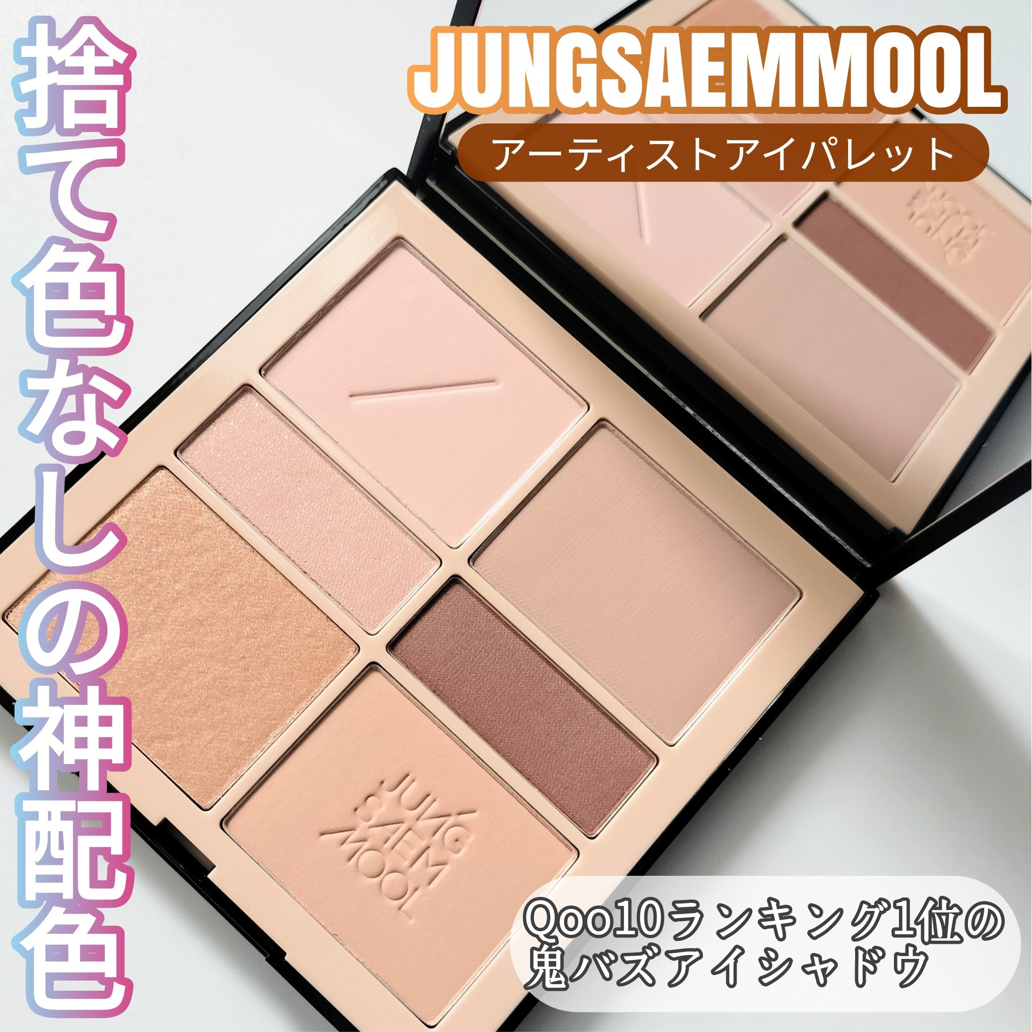 Qoo10ランキング1位✨鬼バズアイシャドウJUNGSAEMMOOLアーティストアイパレット🎨よく使うカラーの面積が大きくて、毎日使いしやすい👼🏻どんな肌トーンにもなじむ、ピンクベージュヌードの万能パレット。ハイライト&シェーディングまでこれ...