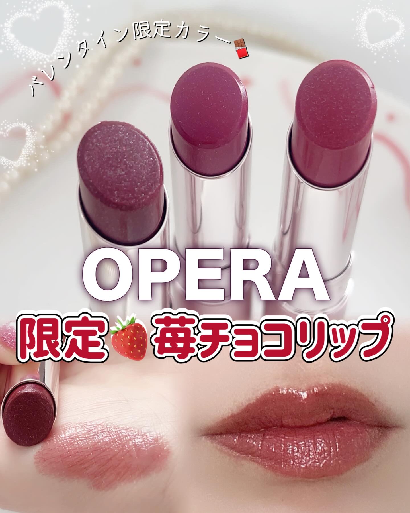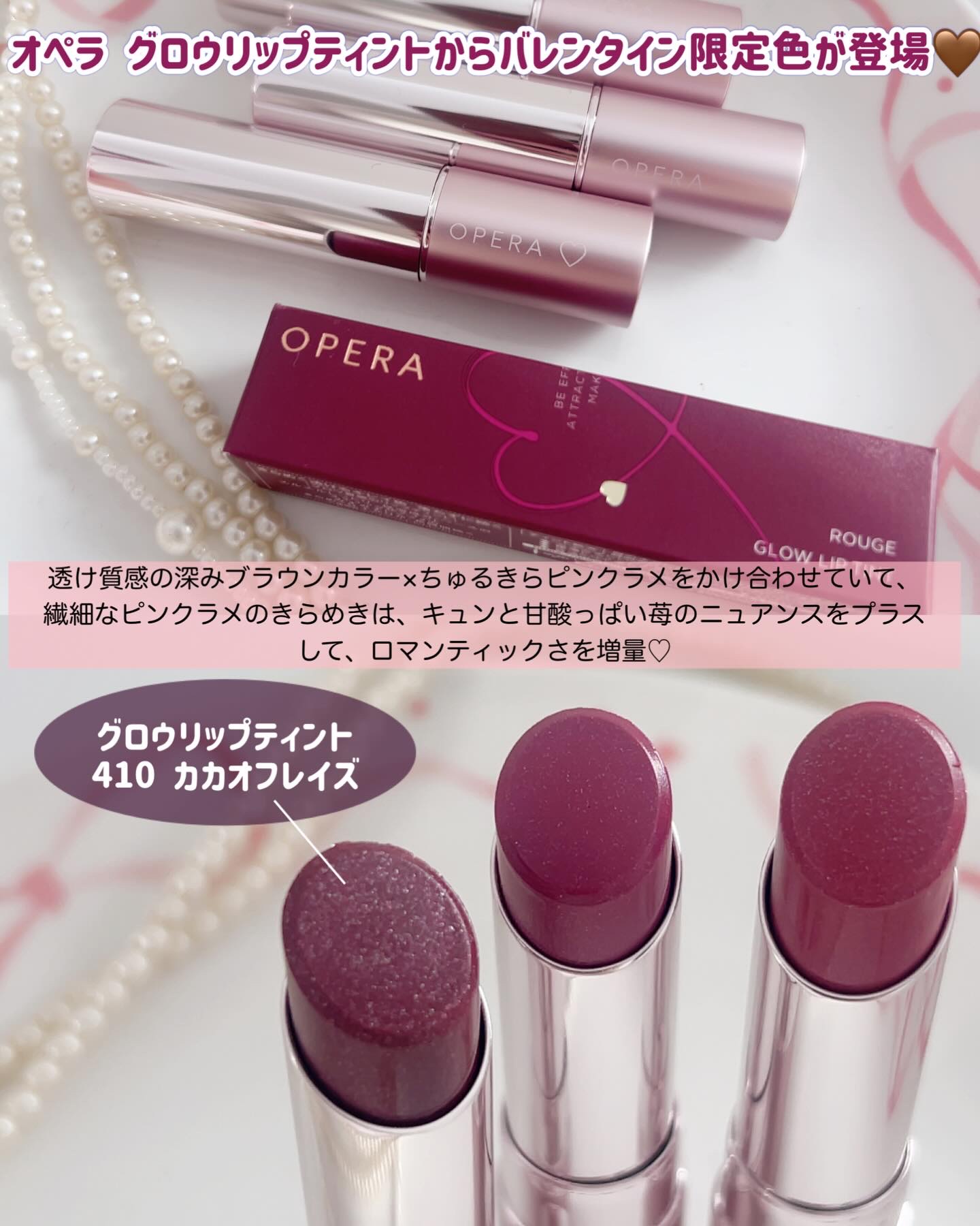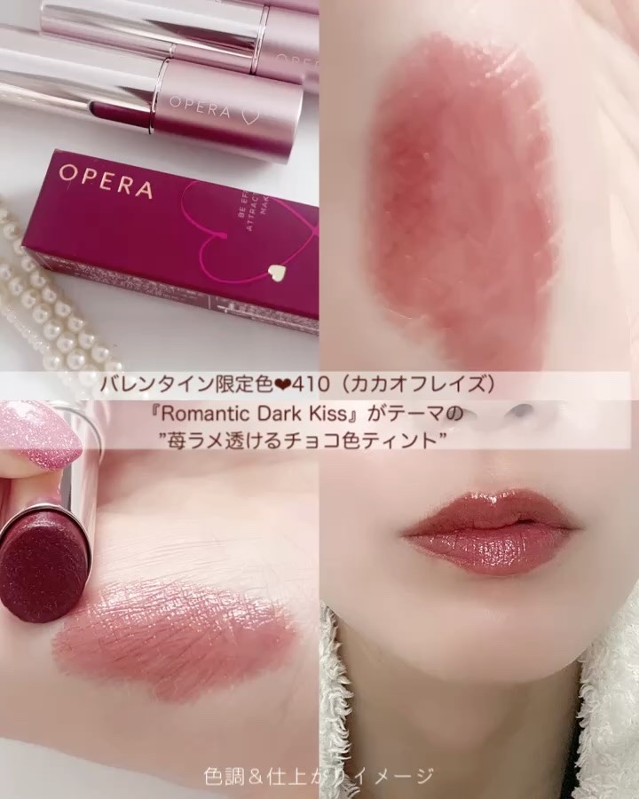 .オペラのティントのバレンタイン限定色410カカオフレイズはピンクラメが入ったチョコレートブラウン🍫🍓フリーズドライのいちごが散りばめられたチョコみたいでかわいすぎませんか…!オペラのリップってかわいらしい感じの色が多いイメージだったけどこれ...