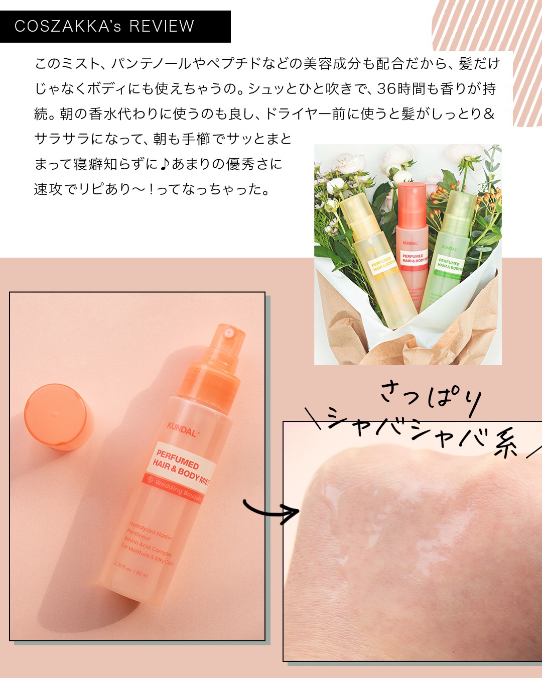 - 髪にも体にも使用できる、天然由来成分をベースにしたKUNDALのヘア&ボディミスト。 エラスチン、パンテノール、アミノ酸複合体などの保湿成分を配合し、乾燥しやすい髪や肌をしっとりとケアしながら、長時間香りをキープします。 ときめきをつめこんだ清楚な爽やかなウェディングブーケの香り。