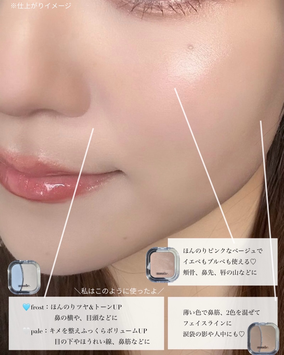 mudeのアイテムで作る立体感⟡.·・フェイスフィルボリューマーハイライター🥂P04セレナーデ透明感のあるスキンベージュビーム🩰P05バレリーナ真珠のように上品なミュートピンクビームサラッとしたサテンのようなツヤ感のハイライト✨️メイクの雰囲...