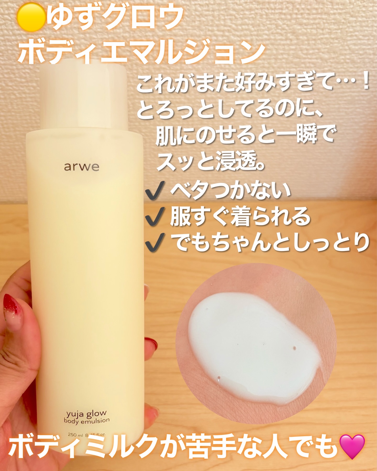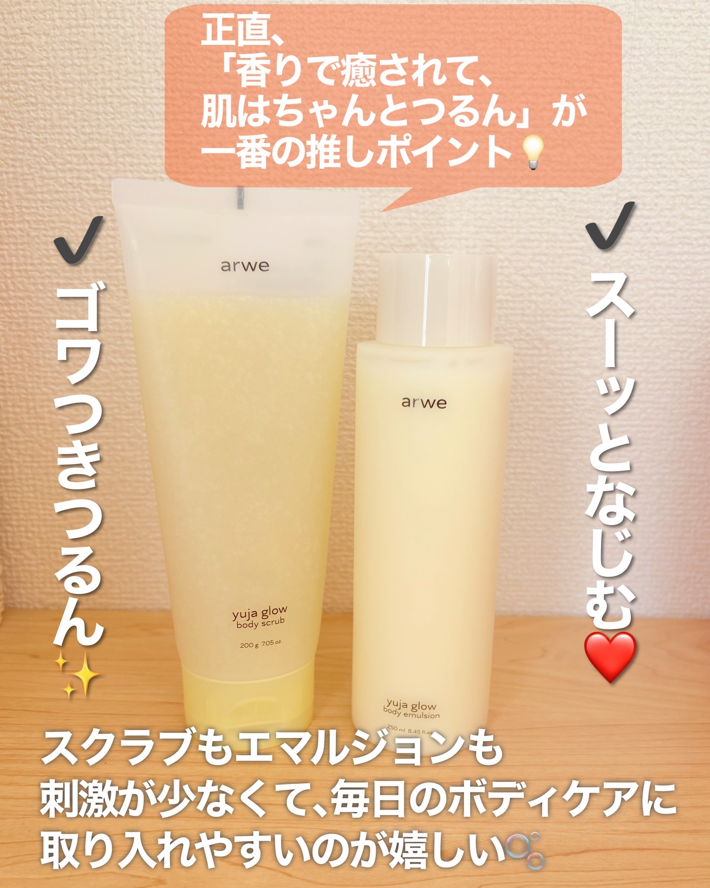 🤍arwe(アルベ)🟡yujaglowbodyscrub🟡yujaglowbodyemulsion韓国のヘア&ボディケアブランド@arwe.jpさまから提供いただきました。《ユズライン》✰肌のキメを整え、ツヤ肌を目指すbodycareライン✰...