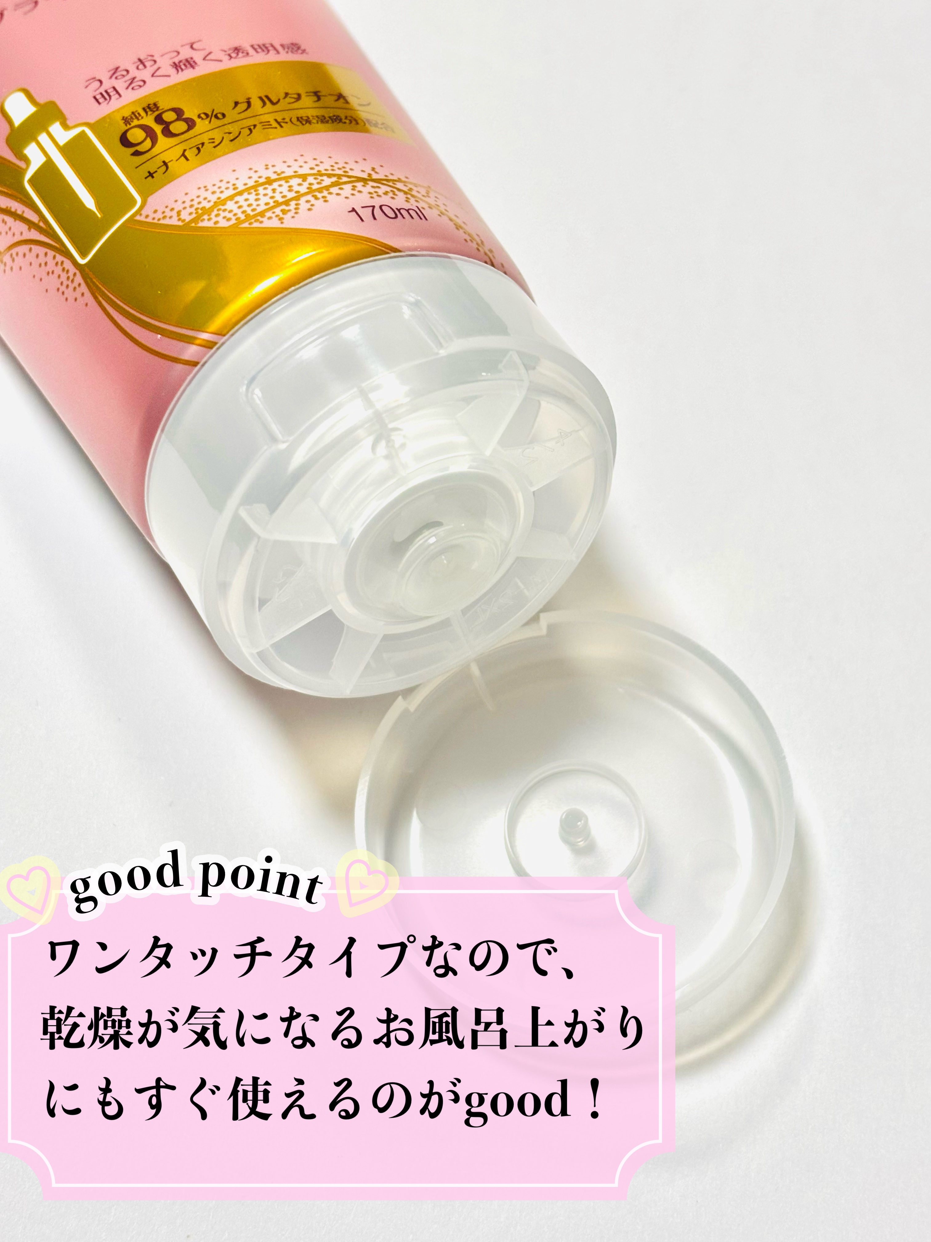 - 純度98%グルタチオン&4種のヒアルロン酸*¹&ナイアシンアミド配合。ピーチ&ローズの香り。 *1 ヒアルロン酸クロスポリマーNa、ヒアルロン酸Na、アセチルヒアルロン酸Na、加水分解ヒアルロン酸Na