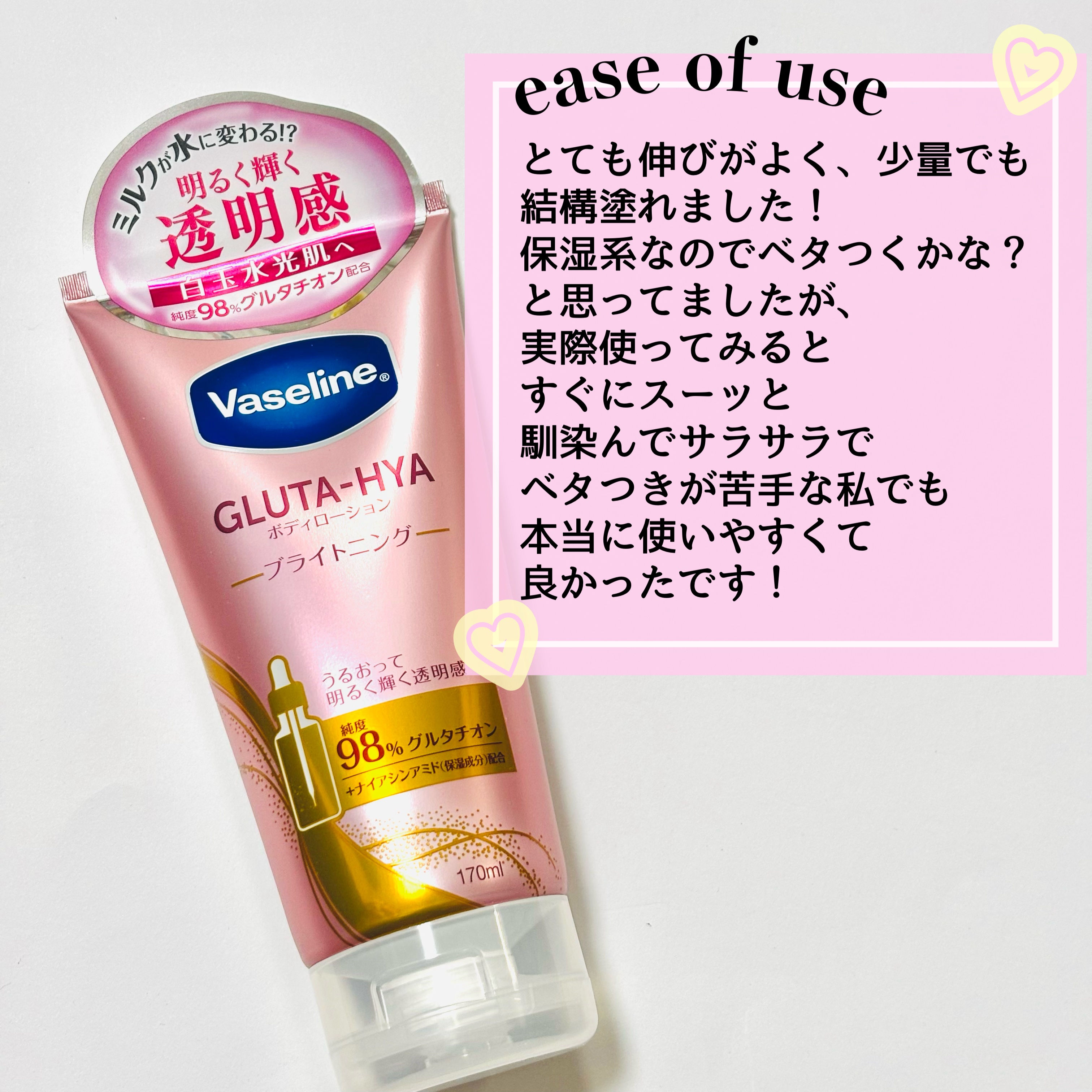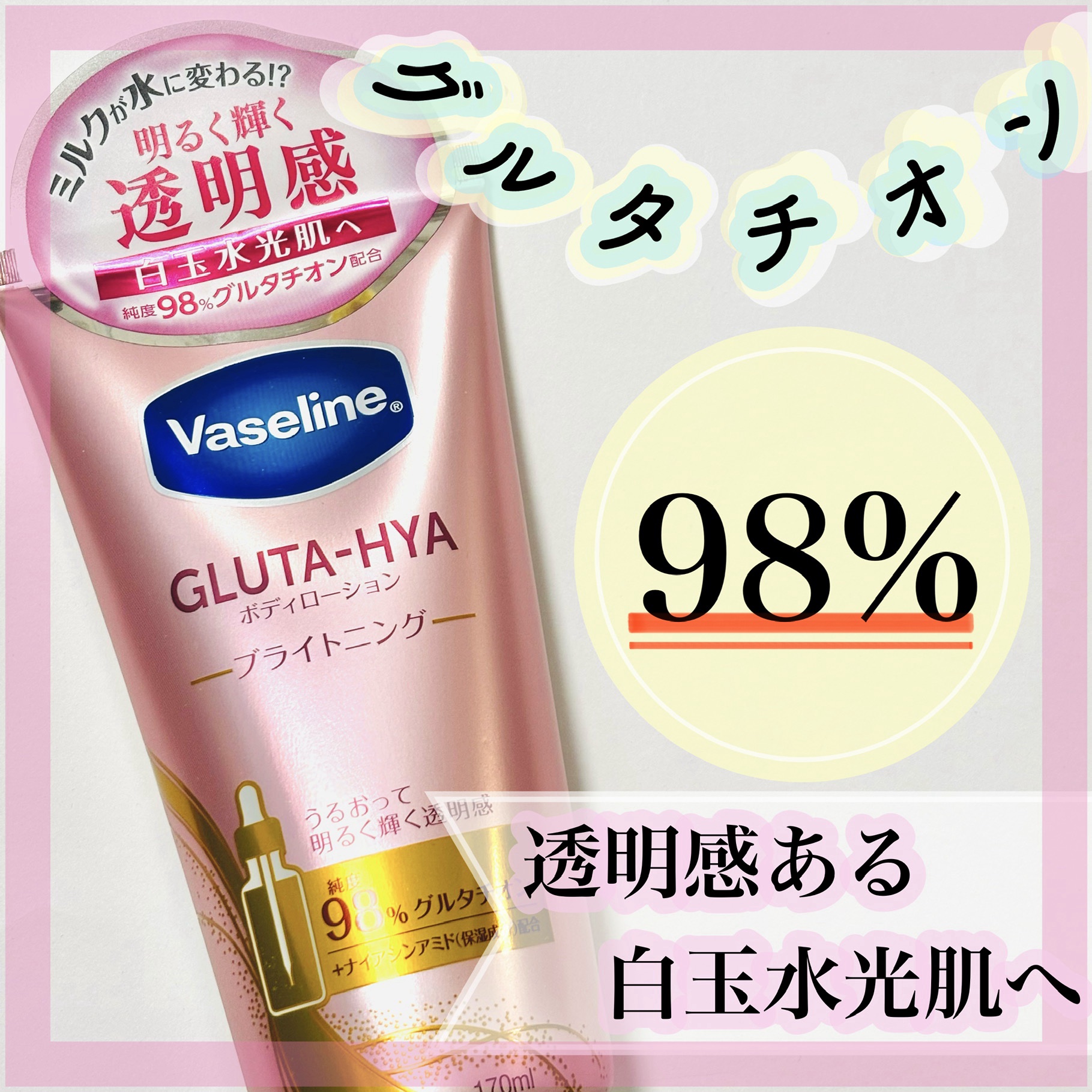 ヴァセリンGLUTA-HYA(グルタヒア)ボディローション ブライトニング海外の方ではすでに発売されてたみたいですね。日本では2月に発売予定。グルタチオン、ヒアルロン酸、ナイアシンアミドなど、こだわりの保湿成分配合。うるおって明るく輝...