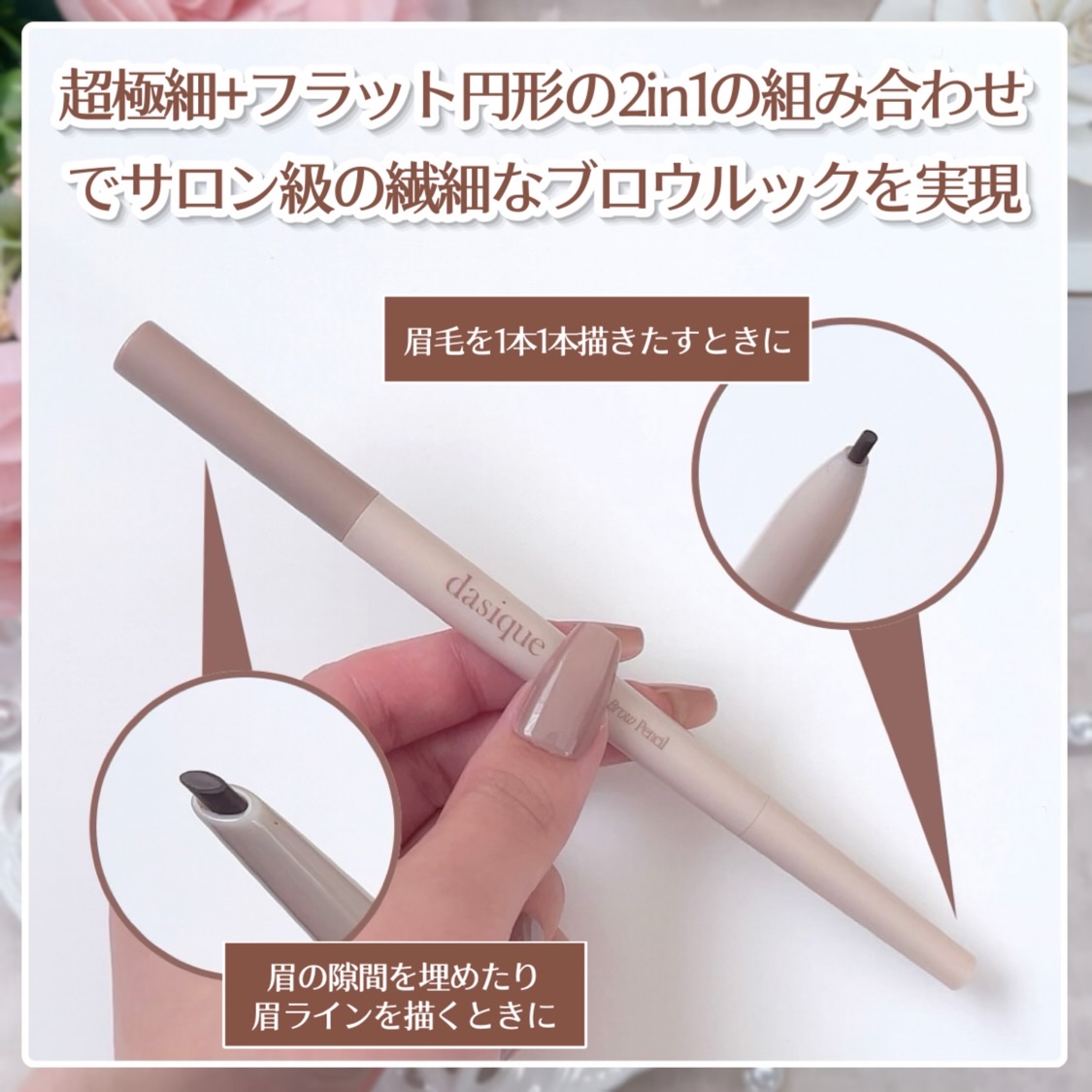 #PRdasique@dasique_jpプロディテールブロウペンシル/05BabyBrownプロスリムブロウカラ/05BabyBrown1mmの超極細ペンシルとフラットな円形ペンシルのデュアルタイプ✨1本1本の毛流れを活かし、隙間なく眉を埋...