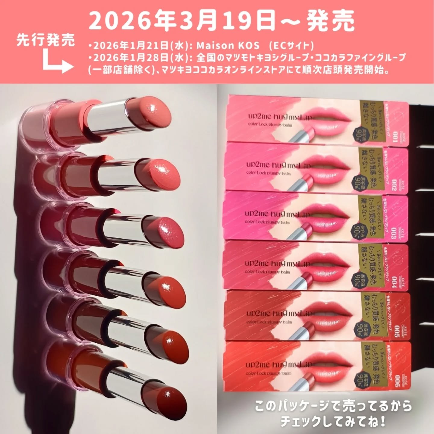 - ぽてっと血色感のある唇、ぎゅっとハグして離さない。なめらかな塗り心地で唇を保護しながら質感・発色つづくプランプ※リップ。※メイク効果 3月19 日より全国の量販店・ドラッ グストアを中心に順次発売* *2026年1月21 日(水)より Maison KOSÉ(EC サイト)にて、1月28 日(水)より全国のマツモトキヨシグループ・ココカラファイングループ(一部店舗除く)、マツキヨココカラオンラインストアにて順次発売開始。