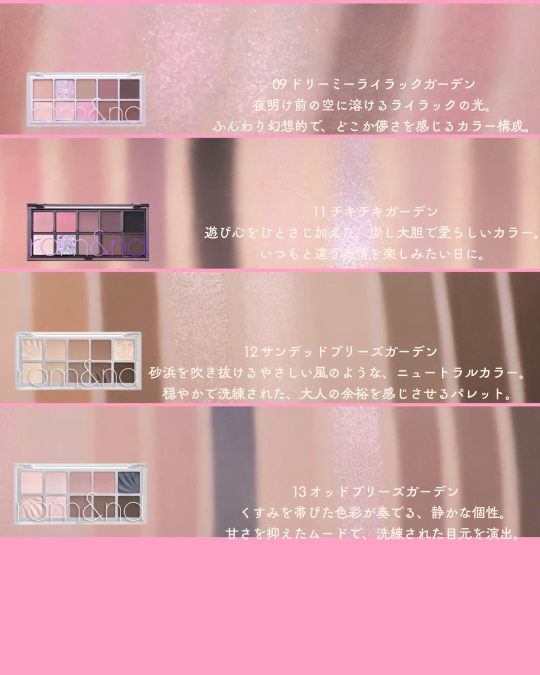 \今ならQoo10の20%メガポや楽天の韓コス祭りでお得に買える/[rom&ndベターザンパレット全色スウォッチ]ロムアンドの10色パレット『ベターザンパレット』の現時点(2025年4月)までに発売されている数量限定色を含む全14種類の全色ス...