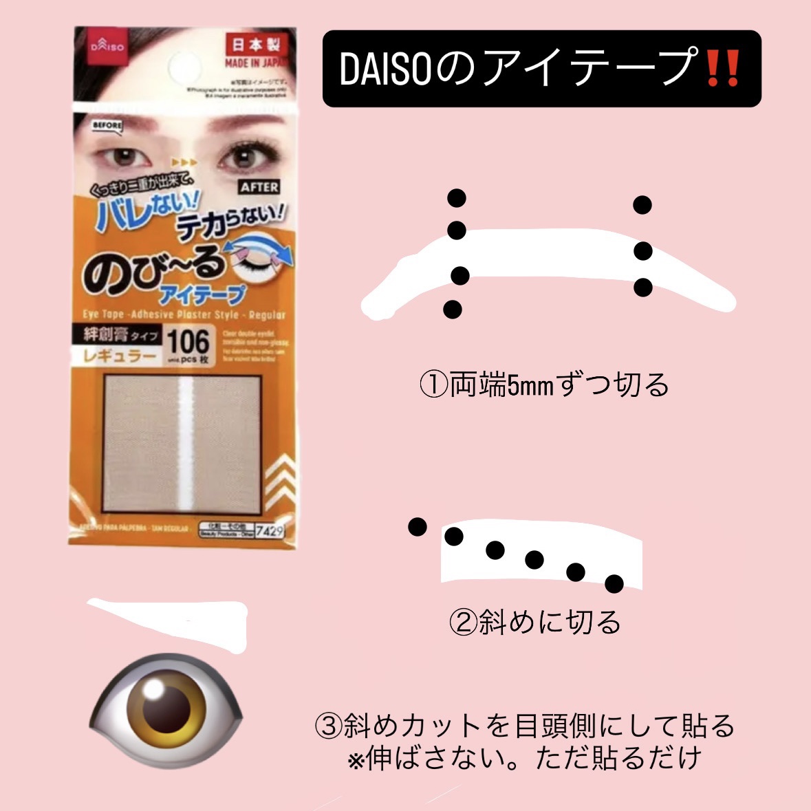 アイプチ苦手勢には厳しいかも…?DAISOアイテープ絆創膏タイプ、レギュラー、70枚レビューDAISOの大人気のび~るアイテープ絆創膏タイプ、レギュラー、70枚を購入しましたこれよく切って使ったりそのまま使ったりしてとても綺麗な二重が作れてい...