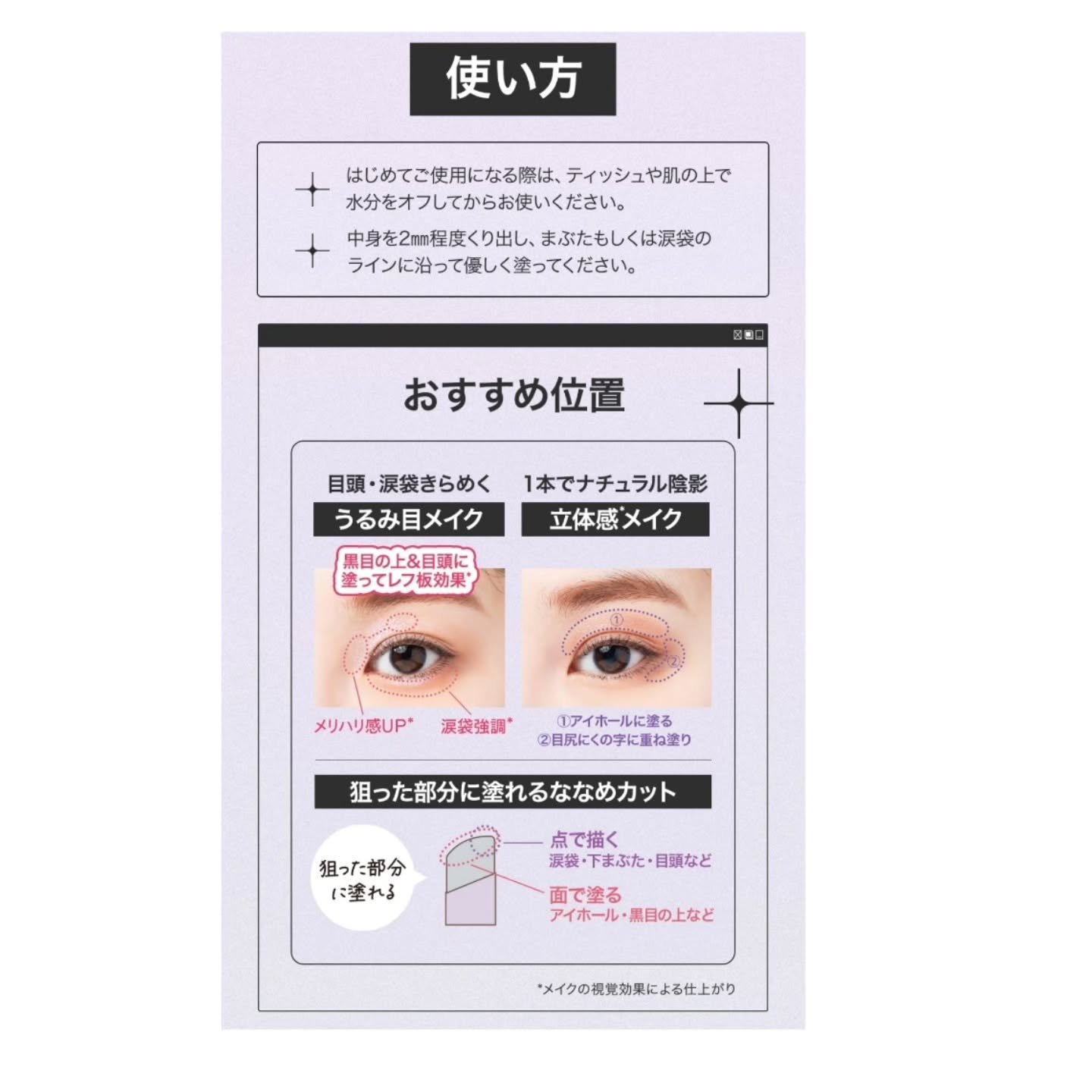 - 失敗しやすい涙袋メイクも秒で完成! テクニックいらずで目元にうるんだようなきらめきと立体感*を叶える、 新感覚のぷるぷるゼリーアイカラースティック。 ■初心者でも失敗しにくい水彩レイヤー処方 高密着でヨレにくい/濃淡調整しやすい透け発色/摩擦の少ない使い心地 *メイクの視覚効果による