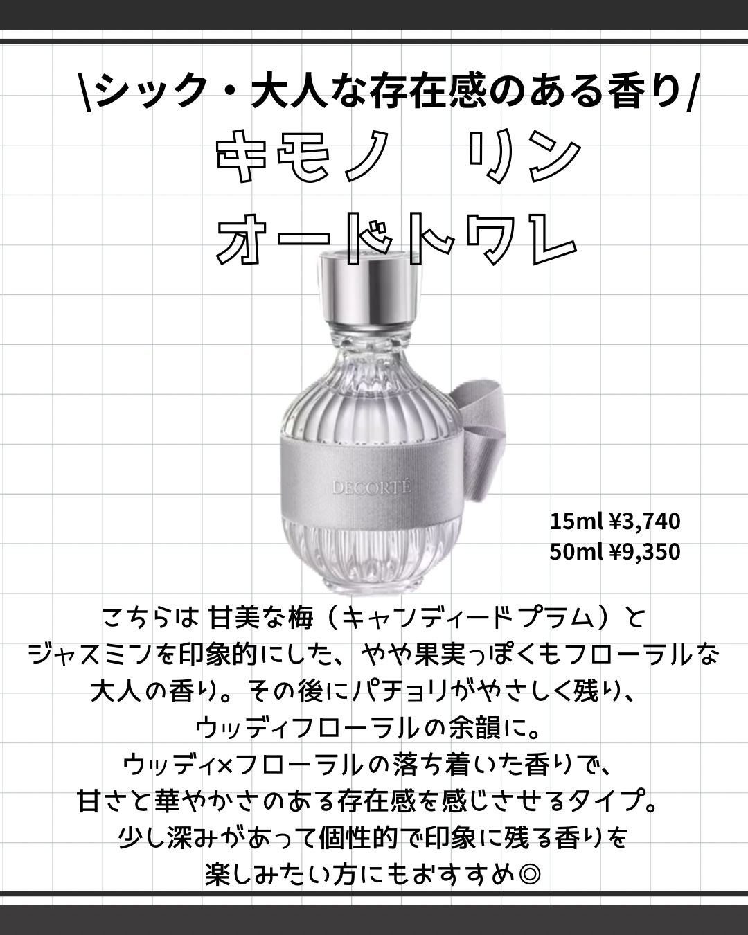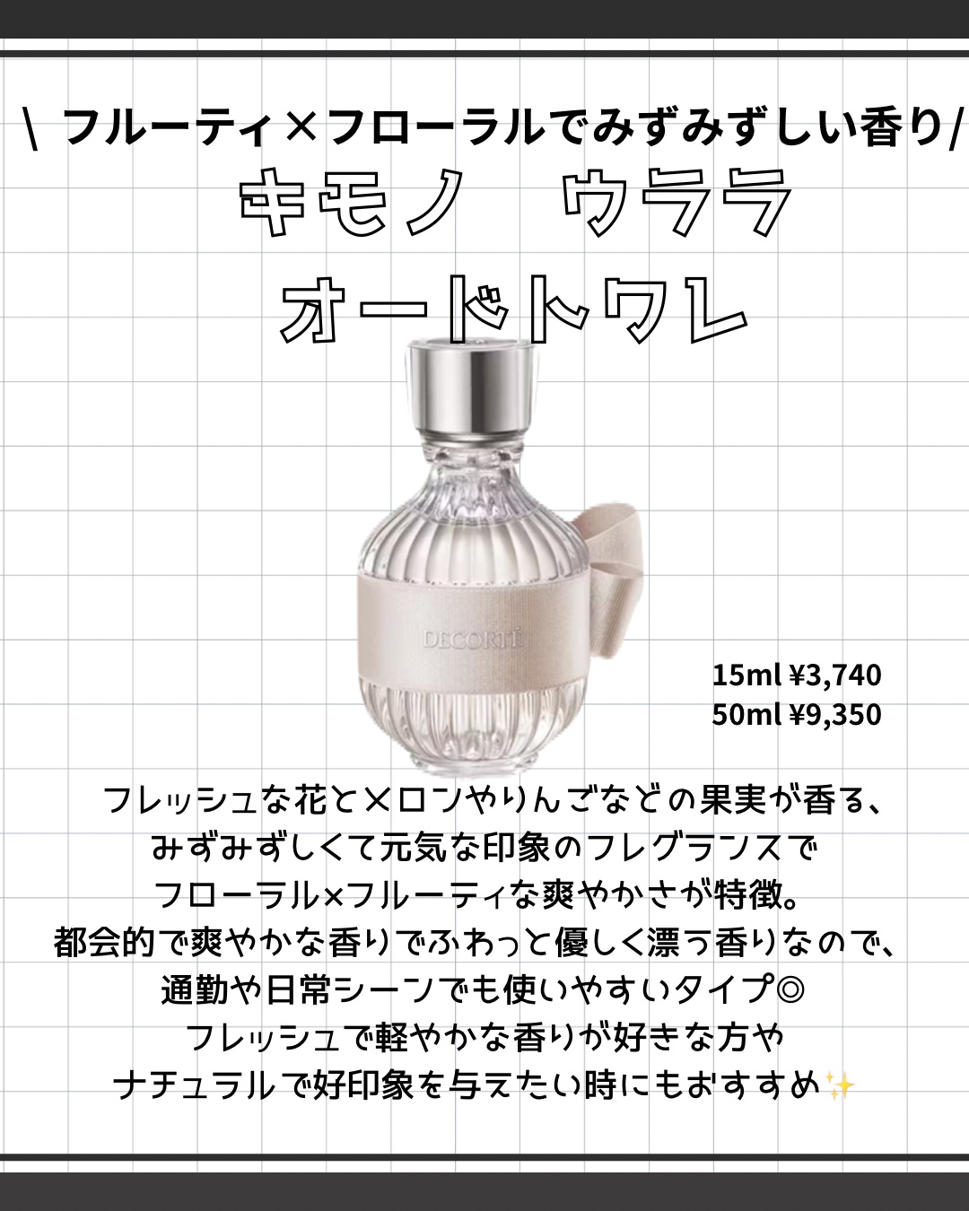 コスメデコルテ キモノシリーズデパコスの香水は高額でなかなか手が出ないし、私は職場ではつけられないので小さいサイズがいい…コスデコのキモノシリーズは、15mlサイズがあるので大きすぎずお値段も試しやすい!私のおすすめは「ウララ」です。他にはな...