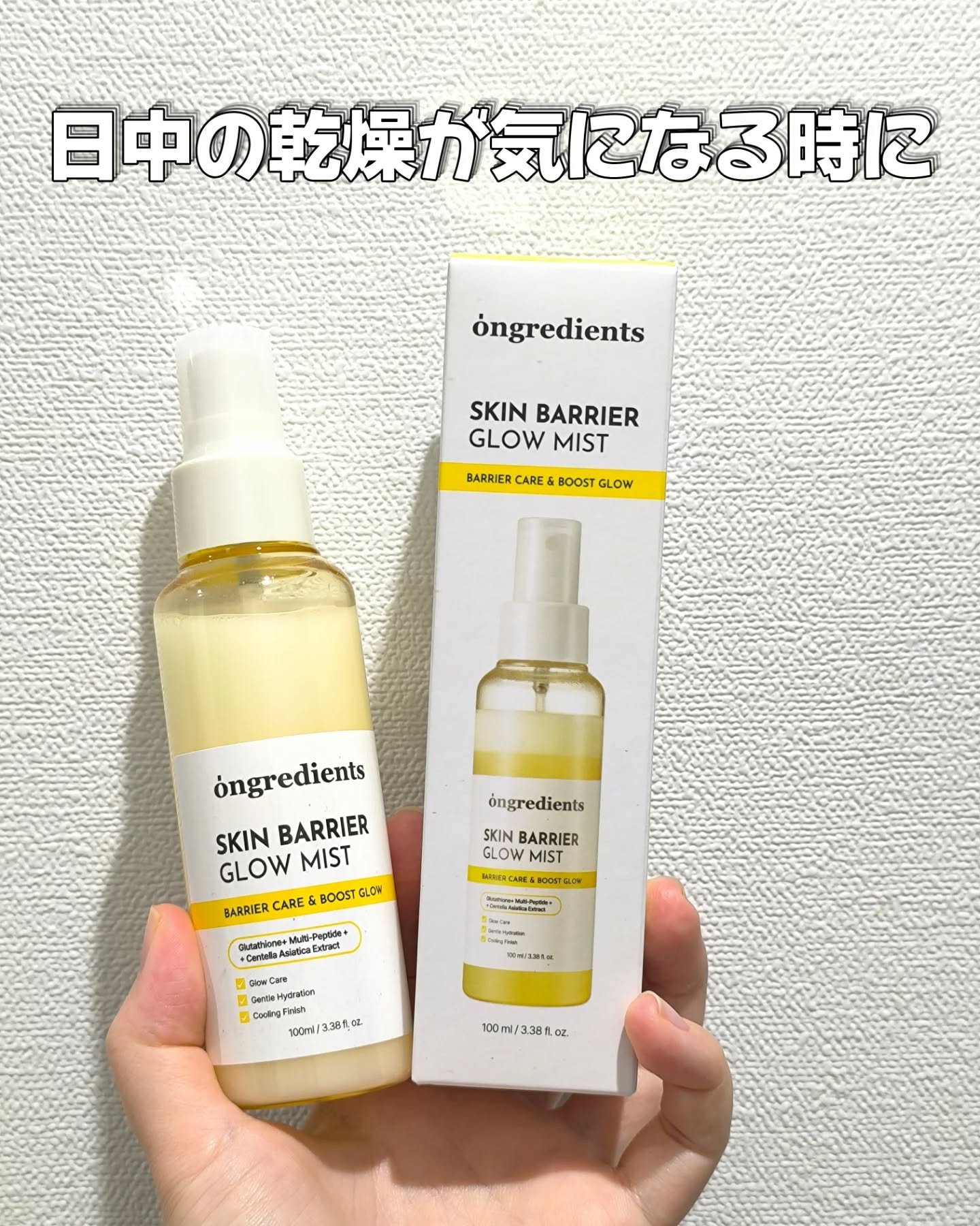 - 「ongredients(オングリディエンツ)」が、ついに日本のオフライン店舗に登場! <2025年8月30日(土)(*1)より全国のプラザ、ドン・キホーテ(*2)にて先行販売を開始> 水光トナーと水分グロウ(ツヤ)成分が融合し、まるでハイライトを施したようなツヤ肌ミストを実現 【主要成分】 ・ツボクサ葉エキス(*3) 乾燥などの外的刺激を受けた肌を整え、肌バリア(*4)機能を守ります。 ・複合ペプチド(*5) 肌のコンディションを整え、ハリのある肌印象へと導きます。 ・ヒアルロン酸(*6)&パンテノール(*7) 乾燥した肌を保湿ししっとり健やかに保ちます。 【こんな方におすすめ】 ・外的刺激により乾燥で肌がゆらぐのが気になる方 ・保湿とキメのダブルケアをしたい方 ・メイクの上からでも!外出先でも、肌にうるおいを与えたい方 (*1)店頭開始日となり、購入可能日は各店舗により異なります。 (*2)一部店舗を除きます。 (*3)整肌成分 (*4)角質層のうるおいを保つこと (*5)トリペプチド-1銅,トリペプチド-1,パルミトイルトリペプチド-1,パルミトイルペンタペプチド-4,ヘキサペプチド-11,ヘキサペプチド-9 (*6)ヒアルロン酸Na,ヒアルロン酸クロスポリマーNa,ヒアルロン酸K,ヒアルロン酸ヒドロキシプロピルトリモニウム,加水分解ヒアルロン酸Na,加水分解ヒアルロン酸,ヒアルロン酸(保湿成分) (*7)保湿成分