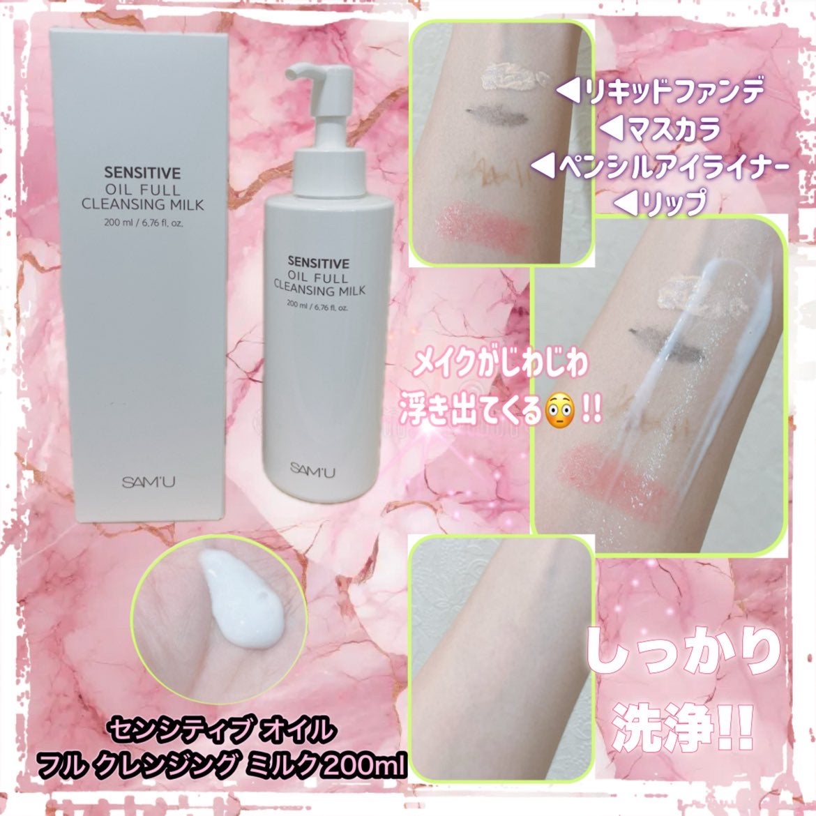 SAM'Uのアンバサダー投稿です!センシティブオイルフルクレンジングミルク刺激DOWN!洗浄力UP!しっとりピュアな使い心地なのに濃いメイクまでしっかり洗浄できるすでに乳化された状態のため、乳化いらずの超簡単洗顔!ローリングするだけでメイク&...