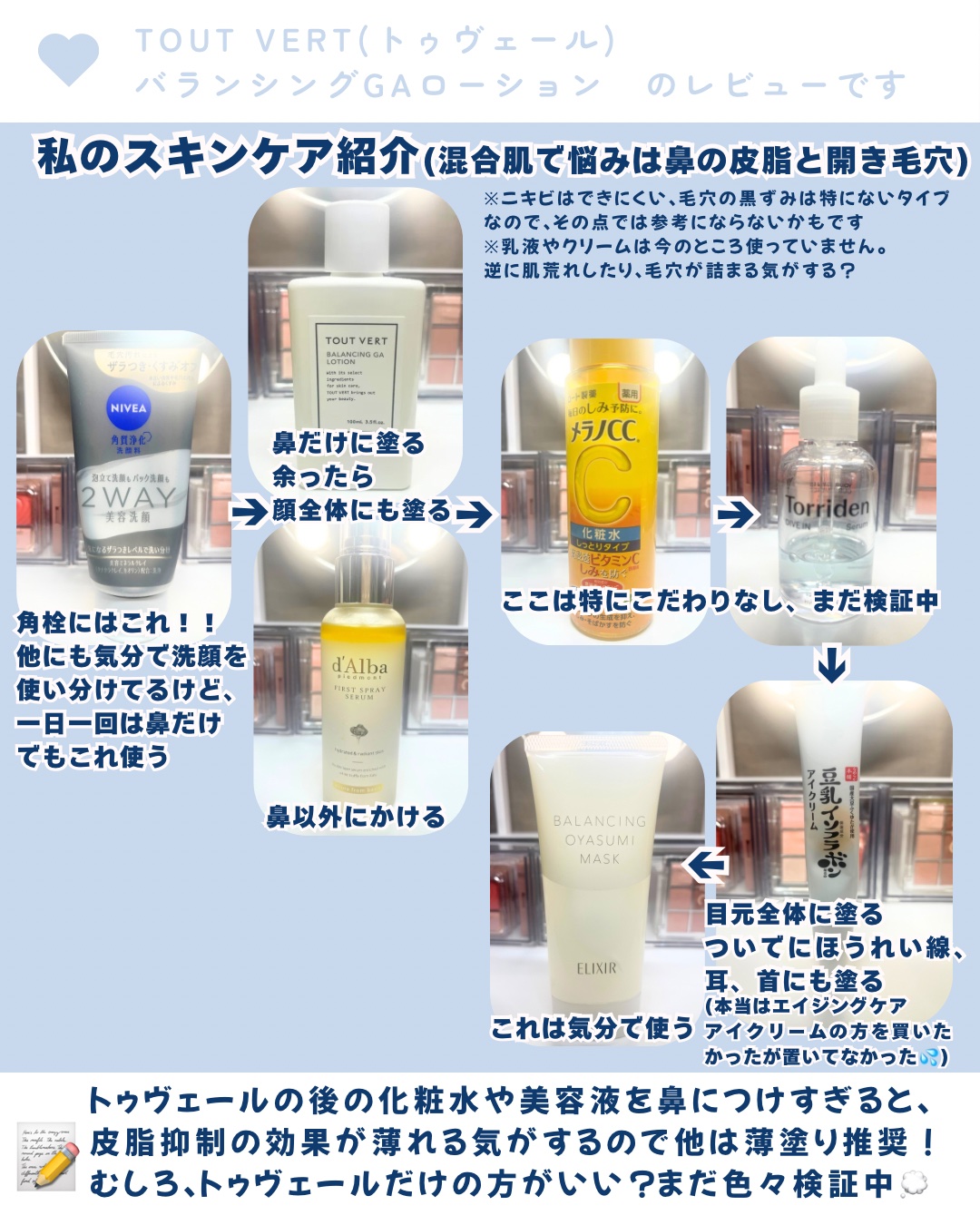 TOUTVERTバランシングGAローション肌のテカリが気になる人におすすめしたい化粧水。かなりサラサラしていて水っぽいテクスチャーなんだけど、適度に保湿力があって、メイク前に使用するのにぴったりだった!軽い使用感だけど乾燥が気になることもなく...