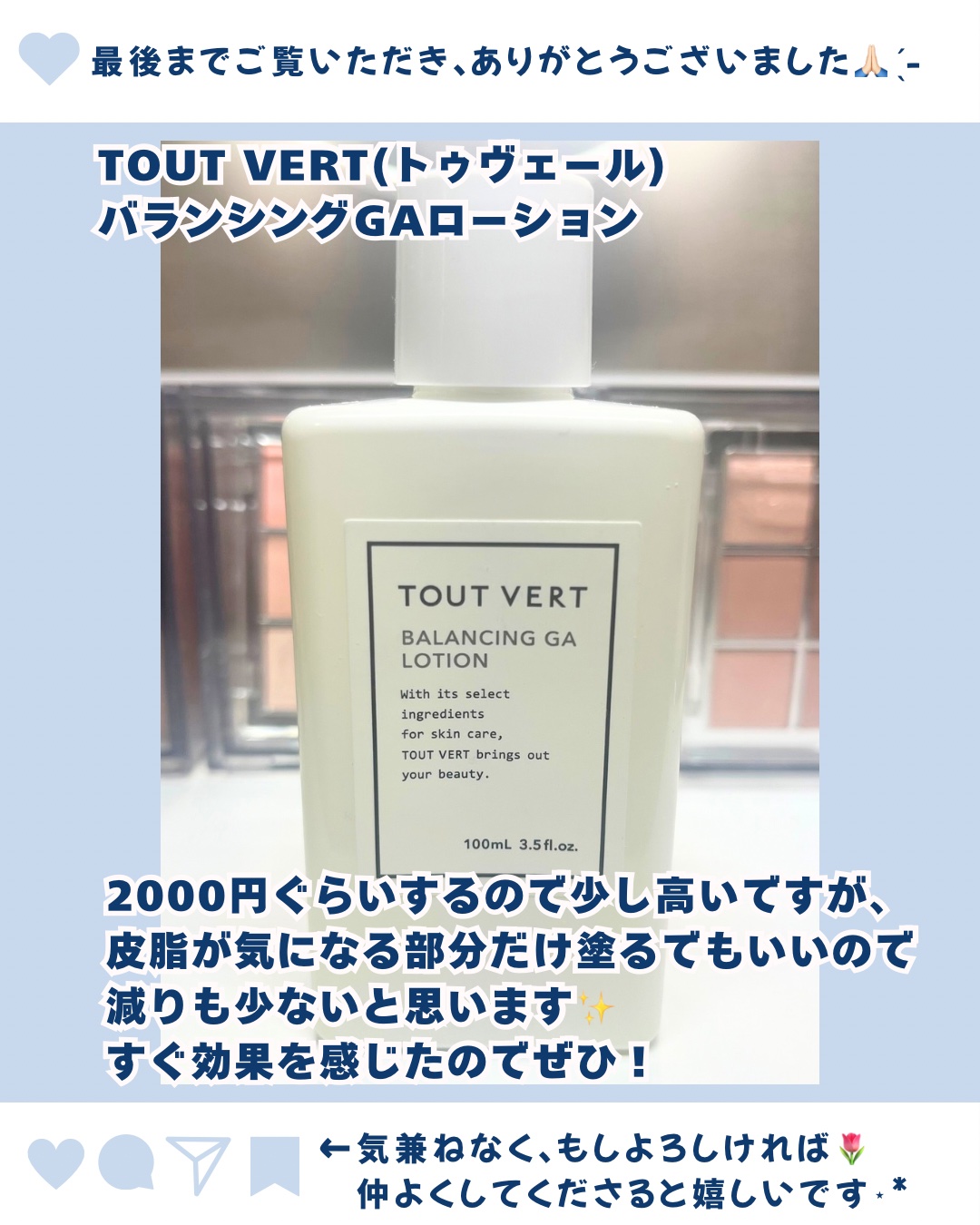 ◡̈*私の投稿を見てくださり、ありがとうございます🙏🏻̖́-少しでも参考になれば嬉しいです♡プレ化粧水💧⋆*TOUTVERT(トゥヴェール)バランシングGAローション皮脂が気になっている方にぜひ使ってほしいです!maiのつぶやき🐹💭 今までは...