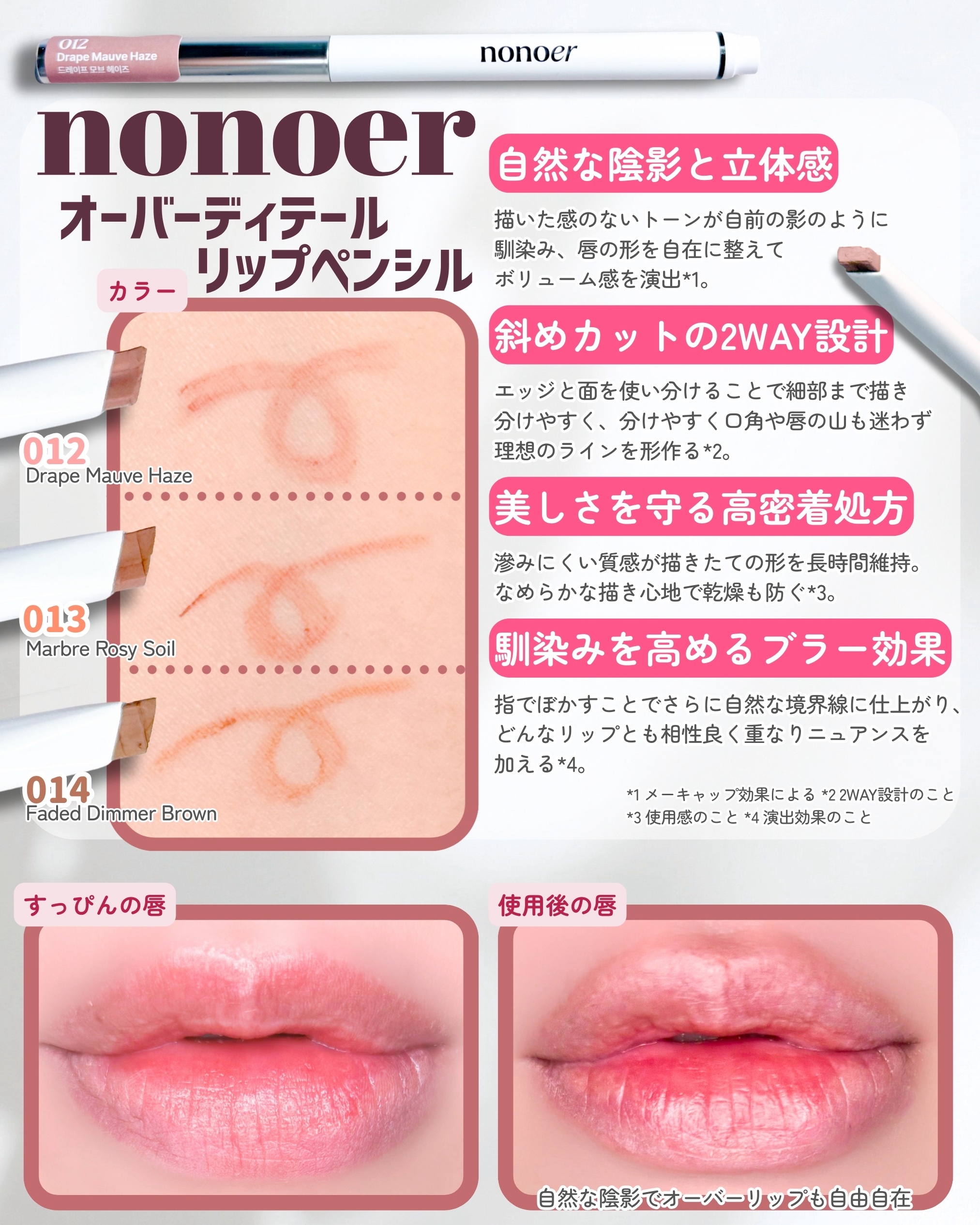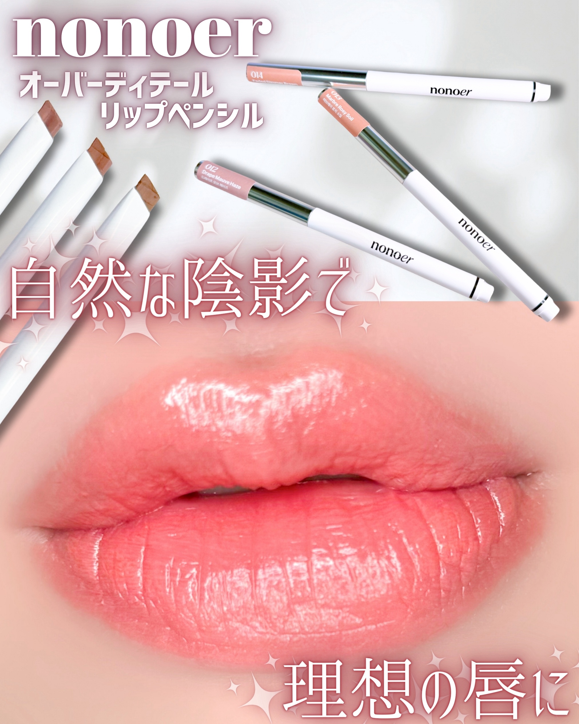 オーバーディテールリップペンシルに新色追加!どれも絶妙なカラーで使いやすい☺️012は口角・山に影を入れると落ち着いた雰囲気に、013はローズ・ピンク系の補正カラーとして、014は口角・下唇に影を入れると引き締まった印象に♡gifted#no...
