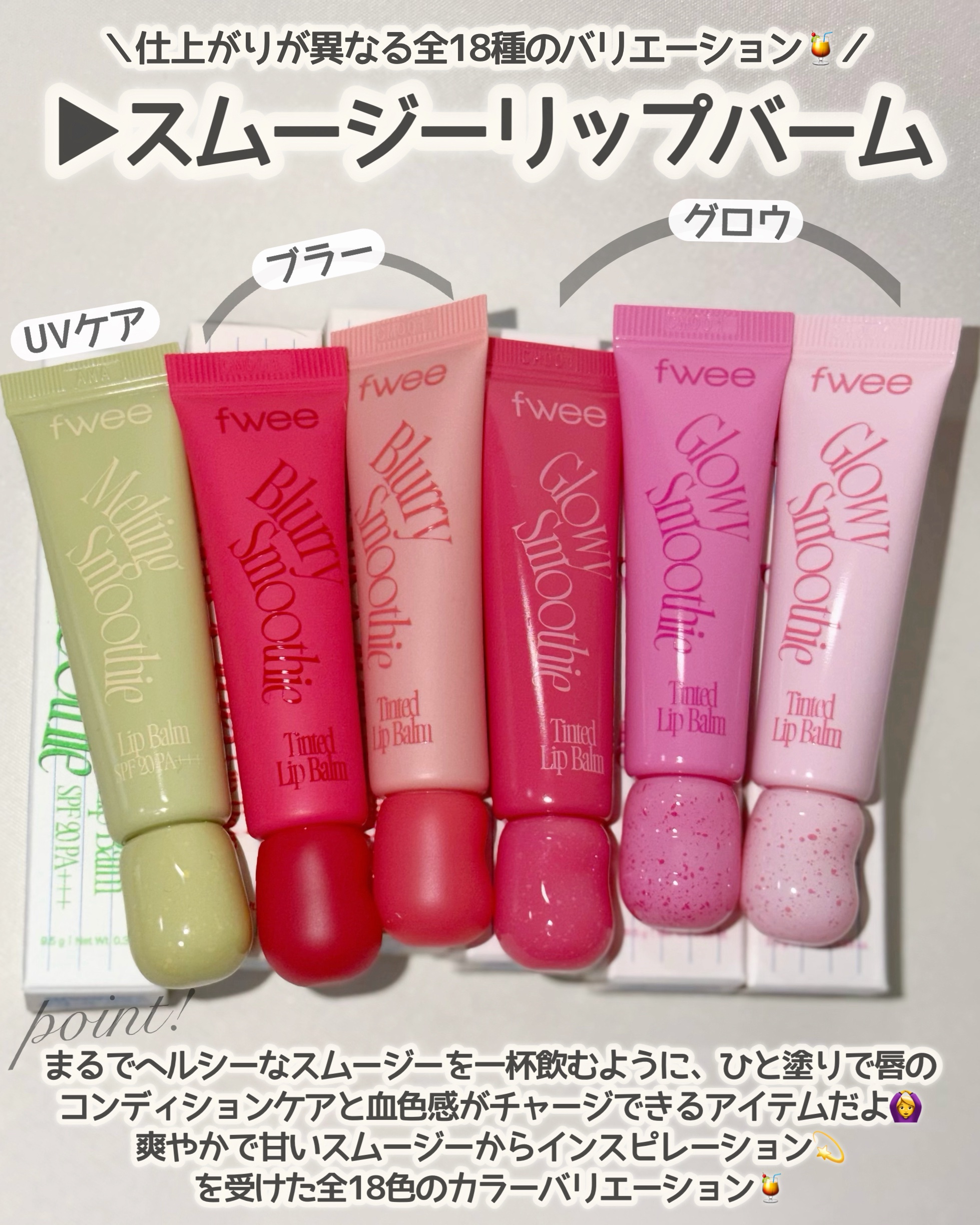 ーfweeの新作、これは沼塗るスムージーリップ🧃🩷🏷fwee▫スムージーリップバーム新作出るたび話題になるfweeだけどこれは正直…沼🫠💗スムージーみたいにするっと溶けて、唇がごくごく飲む感じ。バームなのに重さゼロで乾燥してても一気にちゅるん...