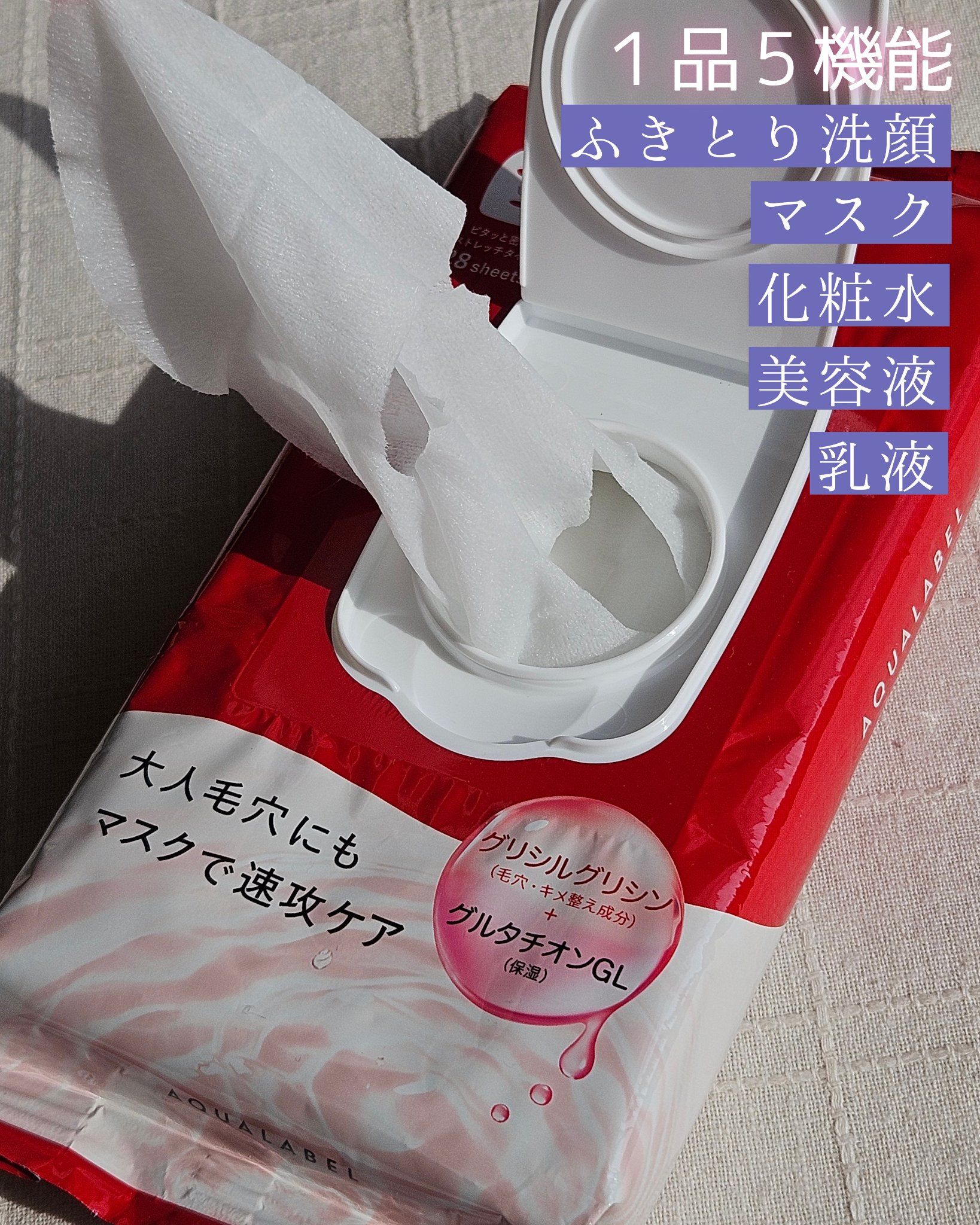 - 限定発売 グリシルグリシン+グルタチオン GL 配合 アクアレーベルから大人毛穴まで速攻ケアするシートマスクが新登場 成分重視派の本格毛穴ケアマスク。 たっぷりのうるおいを与え、毛穴の目立たないなめらかたまご肌へ。 〇大人毛穴までアプローチ!毛穴・キメ整え成分 グリシルグリシン配合 〇グルタチオン GL(グルタチオン、グリセリン/保湿)配合 〇トリメチルグリシン GL(ベタイン、グリセリン/保湿)配合 〇コラーゲン GL(水溶性コラーゲン、グリセリン/保湿)配合 〇W ヒアルロン酸(アセチル化ヒアルロン酸 Na、ヒアルロン酸 Na/保湿)配合 〇美肌に導く 浸透美容アミノ酸(D-グルタミン酸、DL-アラニン、DL-メチオニン/うるおい保持)配合 〇1 品 5 機能(ふきとり洗顔/化粧水/乳液/美容液/マスク) 〇ピタッと密着するストレッチシート 〇気持ちに寄り添う、ハーバルローズの香り 〇アレルギーテスト済み(全ての方にアレルギーが起きないというわけではありません。) 販売チャネル ドラッグストアの一部企業で限定販売