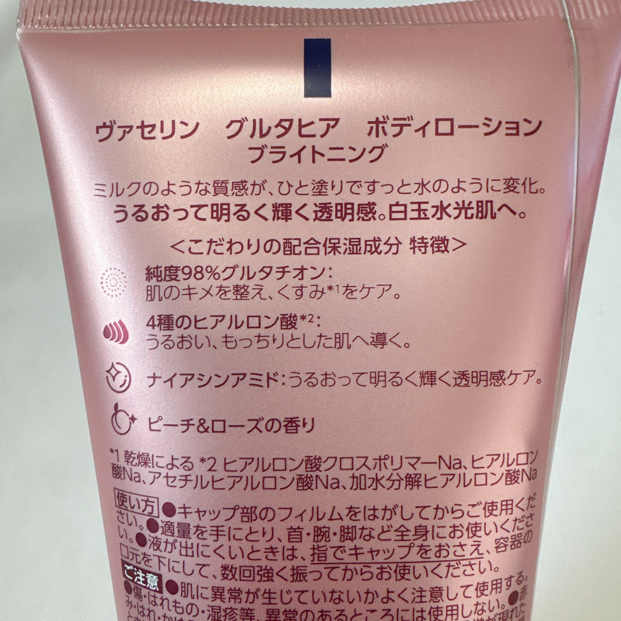 - 純度98%グルタチオン&4種のヒアルロン酸*¹&ナイアシンアミド配合。ピーチ&ローズの香り。 *1 ヒアルロン酸クロスポリマーNa、ヒアルロン酸Na、アセチルヒアルロン酸Na、加水分解ヒアルロン酸Na