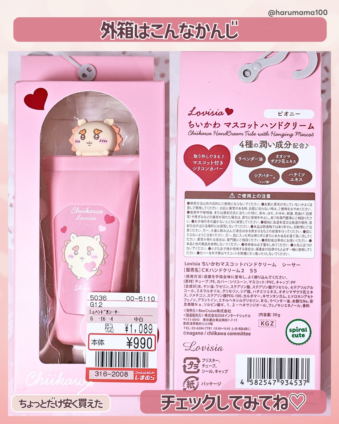- Lovisiaだけのオリジナル立体マスコット付シリコンカバーのついた、ちいかわたちといつでも一緒にいられるキュートなハンドクリームです。 それぞれのキャラクターにマッチした落ち着いたくすみカラーで、ちいかわたちのキュートさをひきたてます。 シリコンカバーに”ちょこん”と乗ったマスコットは、後ろ姿までこだわっています。ちいかわ(ホワイトティーの香り)、ハチワレ(ピンクブーケの香り) 、うさぎ(ホワイトツリーの香り) 、くりまんじゅう(フローラルシャボンの香り) 、モモンガ(サボンの香り) 、ラッコ(キンモクセイの香り) 、シーサー(ピオニーの香り)の全7種類がラインアップされ、思わず集めたくなる、コレクション性も兼ね備えたアイテムです。 保湿成分にもこだわり、ラベンダー油、オオシマザクラ花エキス、シアバター※(シア脂)、ハチミツエキスの4種の潤い成分を配合。ちいかわたちの可愛さとさわやかな香りとともに、手肌をやさしく潤します。