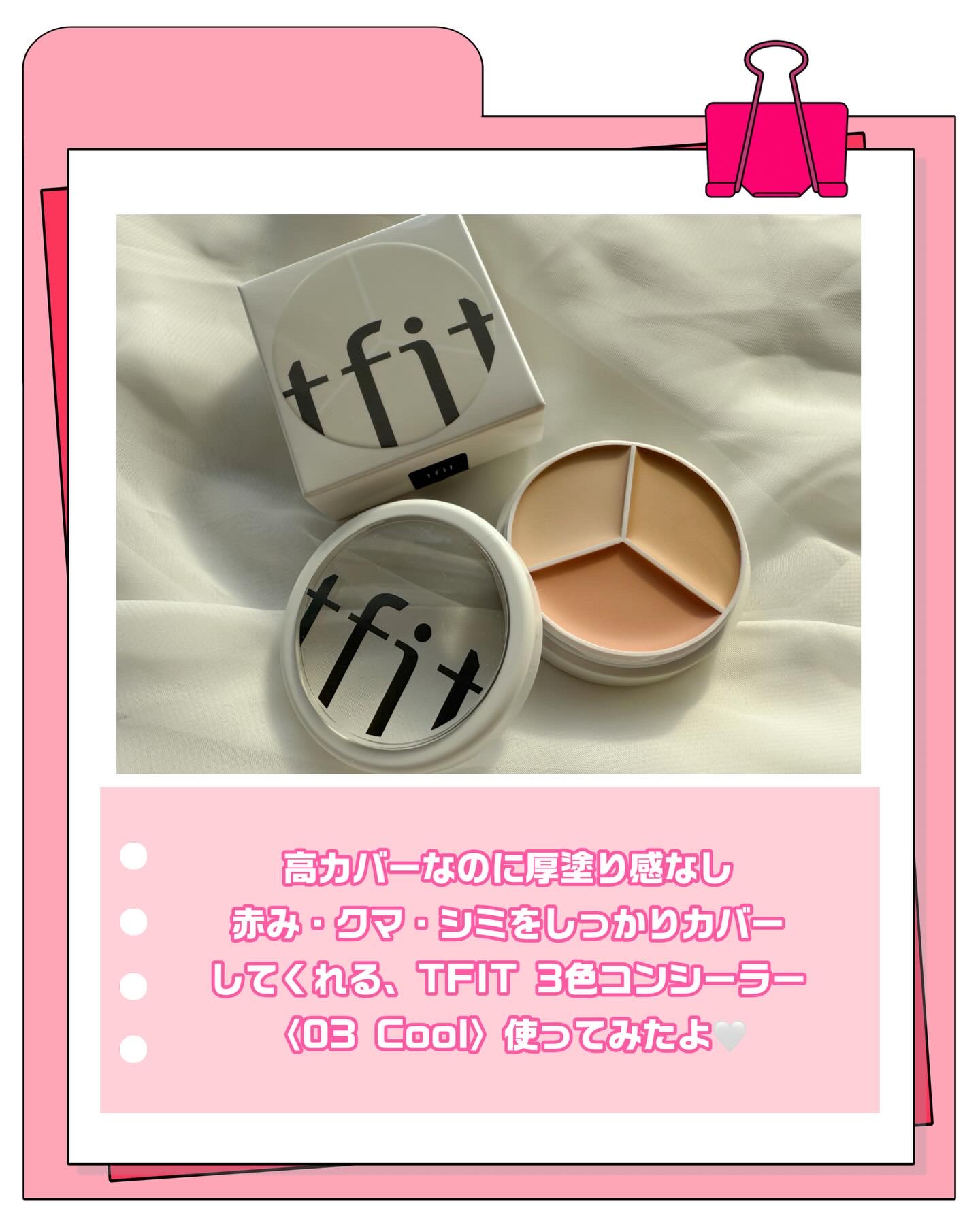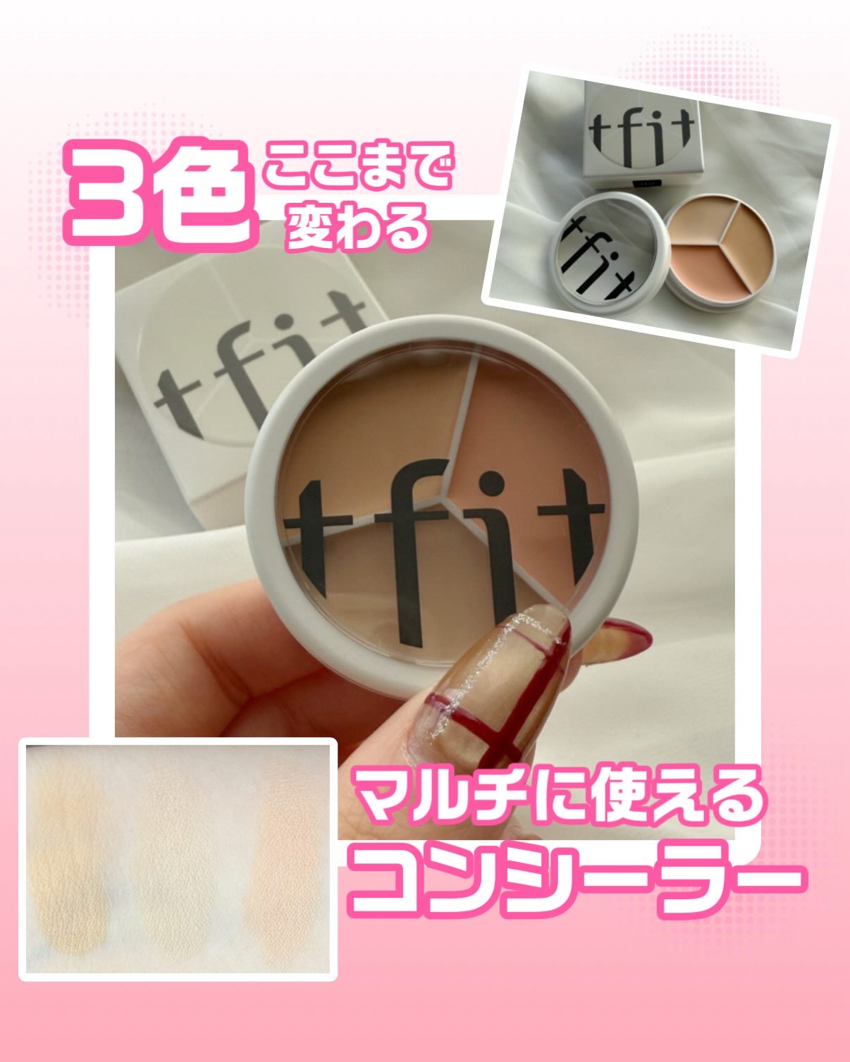 tfit@tfit.japanのカバーアッププロコンシーラー💛01ニュートラルは、イエベさんブルベさんどちらもok👌21号の肌トーンの人におすすめカラー🩷これ1つで3色入り✨固体タイプの3色コンシーラー💕単体で塗ってもよし、混ぜて使ったりお好...
