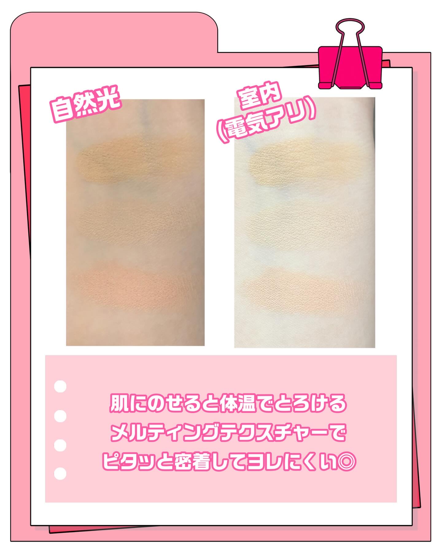 - <クール> [アイボリーベージュ] トリ(カプリル酸/カプリン酸)グリセリル、酸化チタン、ポリイソブテン、メタクリル酸メチルクロスポリマー、ネオペンタン酸イソデシル、マイカ、水添ヒマシ油、エチルヘキサン酸セテアリル、リンゴ酸ジイソステアリル、ビスジグリセリルポリアシルアジペート-2、パラフィン、酸化鉄、1,2-ヘキサンジオール、セスキオレイン酸ソルビタン、水酸化Al [ナチュラルベージュ] トリ(カプリル酸/カプリン酸)グリセリル、酸化チタン、メタクリル酸メチルクロスポリマー、ポリイソブテン、ネオペンタン酸イソデシル、水添ヒマシ油、エチルヘキサン酸セテアリル、酸化鉄、ヘキサ(ヒドロキシステアリン酸/ステアリン酸/ロジン酸)ジペンタエリスリチル、リンゴ酸ジイソステアリル、マイカ、パラフィン、水酸化Al、1,2-ヘキサンジオール、セスキオレイン酸ソルビタン [ピンクベージュ] トリ(カプリル酸/カプリン酸)グリセリル、酸化チタン、ポリイソブテン、メタクリル酸メチルクロスポリマー、ネオペンタン酸イソデシル、マイカ、水添ヒマシ油、エチルヘキサン酸セテアリル、リンゴ酸ジイソステアリル、ビスジグリセリルポリアシルアジペート-2、酸化鉄、パラフィン、1,2-ヘキサンジオール、セスキオレイン酸ソルビタン、水酸化Al [1%未満の共通成分] 水、BG、加水分解ヒアルロン酸、セラミドNP、トリュフエキス、ツベルマグナツムエキス、エチルヘキシルグリセリン、ヒアルロン酸Na、グリセリン、グリシン、セリン、グルタミン酸、アスパラギン酸、ロイシン、アラニン、リシン、アルギニン、チロシン、フェニルアラニン、トレオニン、バリン、プロリン、イソロイシン、ヒスチジン、システイン、メチオニン、マイクロクリスタリンワックス、メチコン、カプリリルグリコール、スクワラン、パンテノール、乳酸桿菌培養溶解質、BHT、糖脂質、オレイン酸ポリグリセリル-10、レスベラトロール、水添レシチン <ニュートラル> [ダークベージュ]トリ(カプリル酸/カプリン酸)グリセリル、酸化チタン、メタクリル酸メチルクロスポリマー、酸化鉄、ポリイソブテン、ネオペンタン酸イソデシル、水添ヒマシ油、エチルヘキサン酸セテアリル、ヘキサ(ヒドロキシステアリン酸/ステアリン酸/ロジン酸)ジペンタエリスリチル、リンゴ酸ジイソステアリル、パラフィン、マイカ、水酸化Al、1,2-ヘキサンジオール、セスキオレイン酸ソルビタン、BHT [ナチュラルベージュ]トリ(カプリル酸/カプリン酸)グリセリル、酸化チタン、ポリメタクリル酸メチル、ポリイソブテン、ネオペンタン酸イソデシル、水添ヒマシ油、エチルヘキサン酸セテアリル、酸化鉄、ヘキサ(ヒドロキシステアリン酸/ステアリン酸/ロジン酸)ジペンタエリスリチル、リンゴ酸ジイソステアリル、マイカ、パラフィン、水酸化Al、1,2-ヘキサンジオール、セスキオレイン酸ソルビタン [ライトベージュ]トリ(カプリル酸/カプリン酸)グリセリル、酸化チタン、メタクリル酸メチルクロスポリマー、ポリイソブテン、ネオペンタン酸イソデシル、水添ヒマシ油、エチルヘキサン酸セテアリル、マイカ、ヘキサ(ヒドロキシステアリン酸/ステアリン酸/ロジン酸)ジペンタエリスリチル、リンゴ酸ジイソステアリル、酸化鉄、パラフィン、水酸化Al、1,2-ヘキサンジオール、セスキオレイン酸ソルビタン、BHT [1%未満の共通成分]水、BG、グリセリン、加水分解ヒアルロン酸、セラミドNP、トリュフエキス、ツベルマグナツムエキス、エチルヘキシルグリセリン、ヒアルロン酸Na、グリシン、セリン、ロイシン、アラニン、リシン、アルギニン、チロシン、フェニルアラニン、プロリン、トレオニン、バリン、イソロイシン、ヒスチジン、メチオニン、システイン、マイクロクリスタリンワックス、カプリリルグリコール、メチコン、スクワラン、パンテノール、乳酸桿菌培養溶解質、糖脂質、オレイン酸ポリグリセリル-10、グルタミン酸、レスベラトロール、水添レシチン、アスパラギン酸
