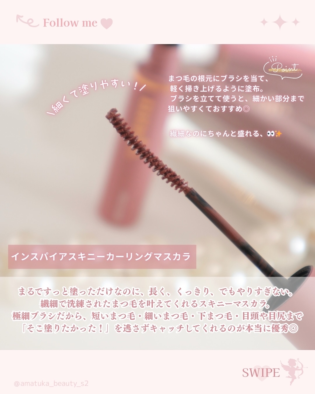 - 極細ブラシが隅々まで塗りやすいスキニータイプのマスカラです。 細いまつ毛や短いまつ毛、塗りにくい下まつ毛など隅々までマスカラ液を塗布して美しいまつ毛を演出します。 また、ウォータープルーフ処方で汗、雨、涙にも強く美しいカーリングを持続させてくれます。