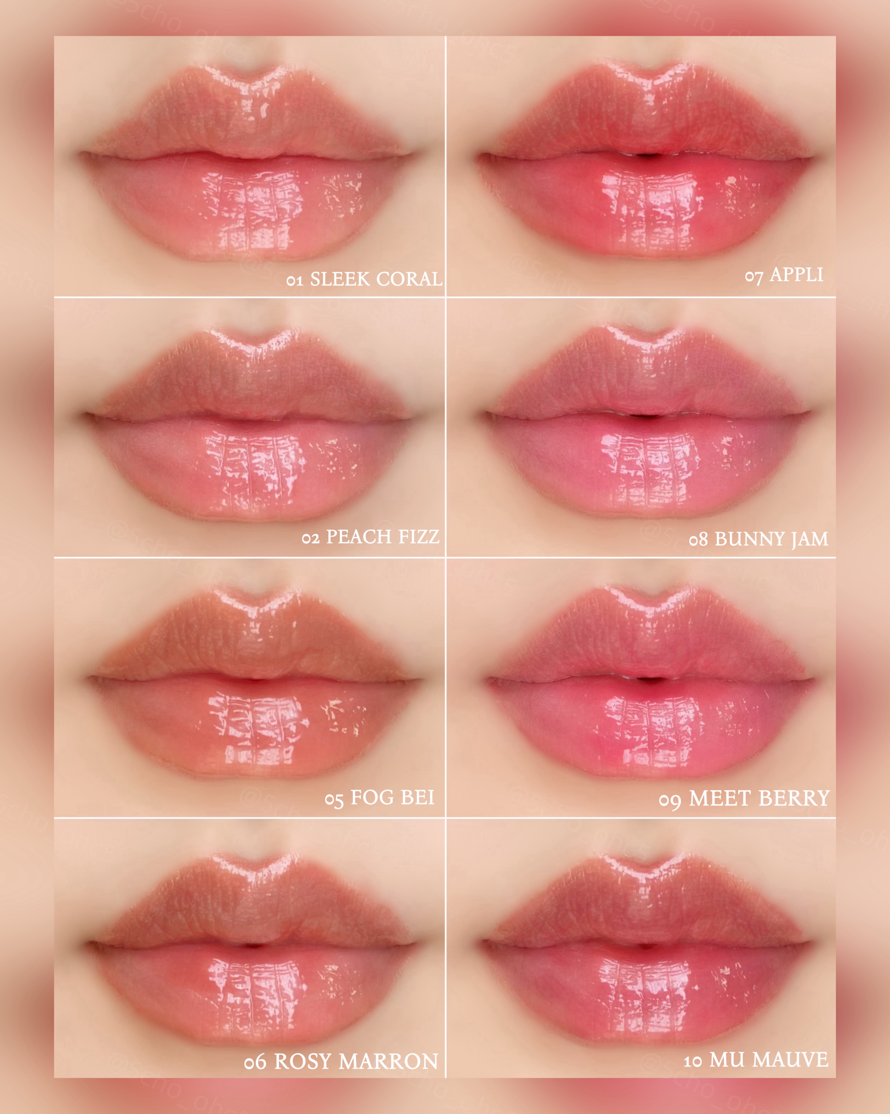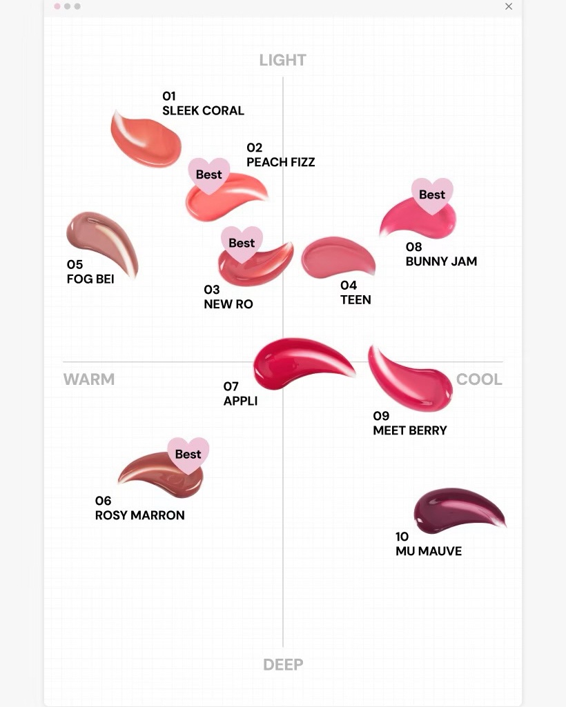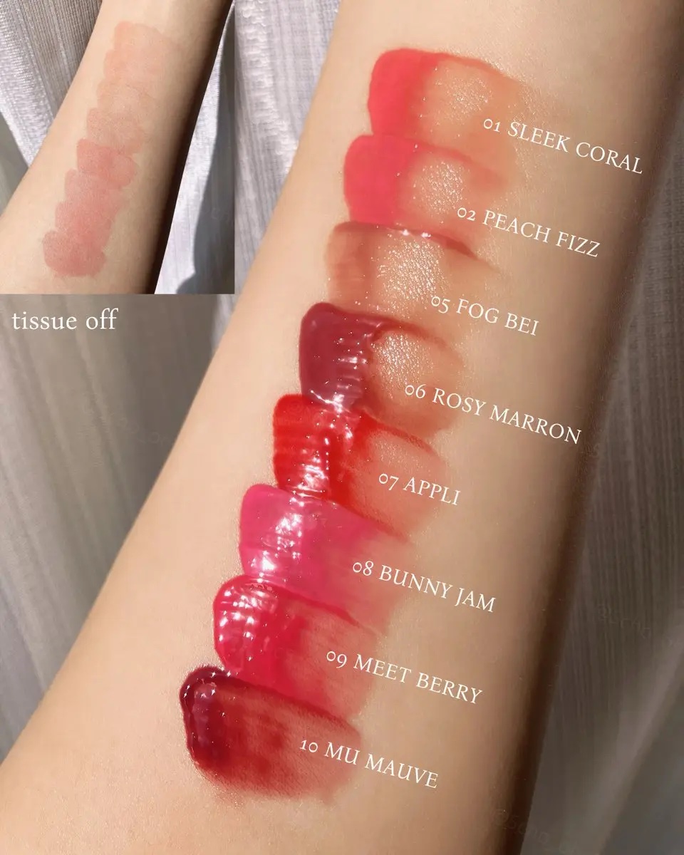 - <01 Sleek Coral> 水、リンゴ酸ジイソステアリル、トリイソステアリン酸ポリグリセリル-2、ビスジグリセリルポリアシルアジペート-2、水添ポリイソブテン、トリメチルシロキシフェニルジメチコン、ポリソルベート60、セチルPEG/PPG-10/1ジメチコン、ジグリセリン、イソステアリン酸ソルビタン、ペンチレングリコール、1,2-ヘキサンジオール、(アクリル酸ヒドロキシエチル/アクリロイルジメチルタウリン)コポリマーNa、スクワラン、酸化チタン、香料、エチルヘキシルグリセリン、黄4、赤227、水酸化Al、ポリアクリル酸アンモニウム、BG、フェノキシエタノール、トコフェロール <02 Peach Fizz> 水、リンゴ酸ジイソステアリル、トリイソステアリン酸ポリグリセリル-2、ビスジグリセリルポリアシルアジペート-2、水添ポリイソブテン、トリメチルシロキシフェニルジメチコン、ポリソルベート60、セチルPEG/PPG-10/1ジメチコン、ジグリセリン、イソステアリン酸ソルビタン、ペンチレングリコール、1,2-ヘキサンジオール、(アクリル酸ヒドロキシエチル/アクリロイルジメチルタウリン)コポリマーNa、スクワラン、酸化チタン、香料、エチルヘキシルグリセリン、黄4、赤227、水酸化Al、ポリアクリル酸アンモニウム、BG、フェノキシエタノール、トコフェロール <03 New Ro> 水、リンゴ酸ジイソステアリル、トリイソステアリン酸ポリグリセリル-2、ビスジグリセリルポリアシルアジペート-2、水添ポリイソブテン、トリメチルシロキシフェニルジメチコン、ポリソルベート60、セチルPEG/PPG-10/1ジメチコン、ジグリセリン、イソステアリン酸ソルビタン、ペンチレングリコール、1,2-ヘキサンジオール、(アクリル酸ヒドロキシエチル/アクリロイルジメチルタウリン)コポリマーNa、スクワラン、酸化チタン、香料、エチルヘキシルグリセリン、黄5、赤227、水酸化Al、ポリアクリル酸アンモニウム、BG、フェノキシエタノール、青1、トコフェロール <04 Teen> 水、リンゴ酸ジイソステアリル、トリイソステアリン酸ポリグリセリル-2、ビスジグリセリルポリアシルアジペート-2、水添ポリイソブテン、トリメチルシロキシフェニルジメチコン、ポリソルベート60、セチルPEG/PPG-10/1ジメチコン、ジグリセリン、イソステアリン酸ソルビタン、ペンチレングリコール、1,2-ヘキサンジオール、(アクリル酸ヒドロキシエチル/アクリロイルジメチルタウリン)コポリマーNa、酸化チタン、スクワラン、香料、エチルヘキシルグリセリン、黄5、赤227、水酸化Al、ポリアクリル酸アンモニウム、黄4、BG、フェノキシエタノール、青1、トコフェロール <05 Fog Bei> 水、リンゴ酸ジイソステアリル、トリイソステアリン酸ポリグリセリル-2、ビスジグリセリルポリアシルアジペート-2、水添ポリイソブテン、トリメチルシロキシフェニルジメチコン、ポリソルベート60、セチルPEG/PPG-10/1ジメチコン、ジグリセリン、イソステアリン酸ソルビタン、ペンチレングリコール、1,2-ヘキサンジオール、(アクリル酸ヒドロキシエチル/アクリロイルジメチルタウリン)コポリマーNa、スクワラン、酸化チタン、香料、エチルヘキシルグリセリン、黄5、赤227、水酸化Al、ポリアクリル酸アンモニウム、青1、BG、フェノキシエタノール、トコフェロール <06 Rosy Marron> 水、リンゴ酸ジイソステアリル、トリイソステアリン酸ポリグリセリル-2、ビスジグリセリルポリアシルアジペート-2、水添ポリイソブテン、トリメチルシロキシフェニルジメチコン、ポリソルベート60、セチルPEG/PPG-10/1ジメチコン、ジグリセリン、イソステアリン酸ソルビタン、ペンチレングリコール、1,2-ヘキサンジオール、(アクリル酸ヒドロキシエチル/アクリロイルジメチルタウリン)コポリマーNa、スクワラン、酸化チタン、香料、エチルヘキシルグリセリン、赤227、黄5、黄4、水酸化Al、ポリアクリル酸アンモニウム、青1、BG、フェノキシエタノール、トコフェロール <07 Appli> 水、リンゴ酸ジイソステアリル、トリイソステアリン酸ポリグリセリル-2、ビスジグリセリルポリアシルアジペート-2、水添ポリイソブテン、トリメチルシロキシフェニルジメチコン、ポリソルベート60、セチルPEG/PPG-10/1ジメチコン、ジグリセリン、イソステアリン酸ソルビタン、ペンチレングリコール、1,2-ヘキサンジオール、(アクリル酸ヒドロキシエチル/アクリロイルジメチルタウリン)コポリマーNa、スクワラン、香料、エチルヘキシルグリセリン、黄5、赤227、トコフェロール <08 Bunny Jam> 水、リンゴ酸ジイソステアリル、トリイソステアリン酸ポリグリセリル-2、ビスジグリセリルポリアシルアジペート-2、水添ポリイソブテン、トリメチルシロキシフェニルジメチコン、ポリソルベート60、セチルPEG/PPG-10/1ジメチコン、ジグリセリン、イソステアリン酸ソルビタン、ペンチレングリコール、1,2-ヘキサンジオール、(アクリル酸ヒドロキシエチル/アクリロイルジメチルタウリン)コポリマーNa、酸化チタン、スクワラン、香料、エチルヘキシルグリセリン、赤227、黄4、