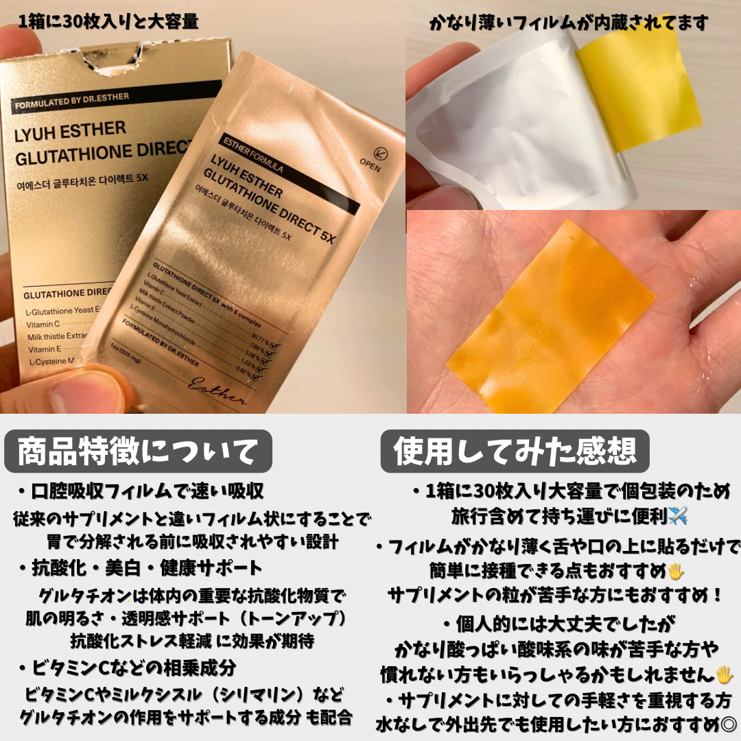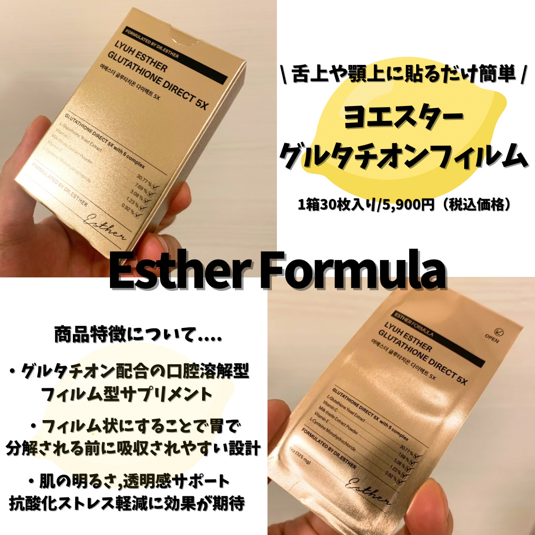 ESTHERFORMULA/LYUHESTHERGLUTATHIONEDIRECT5X口の中にペタッと貼って摂取するフィルムタイプのサプリメント🤍口腔溶解フィルム(ODF)で作られていて、消化器官を通さず口の中の粘膜に直接貼るのでグルタチオン...