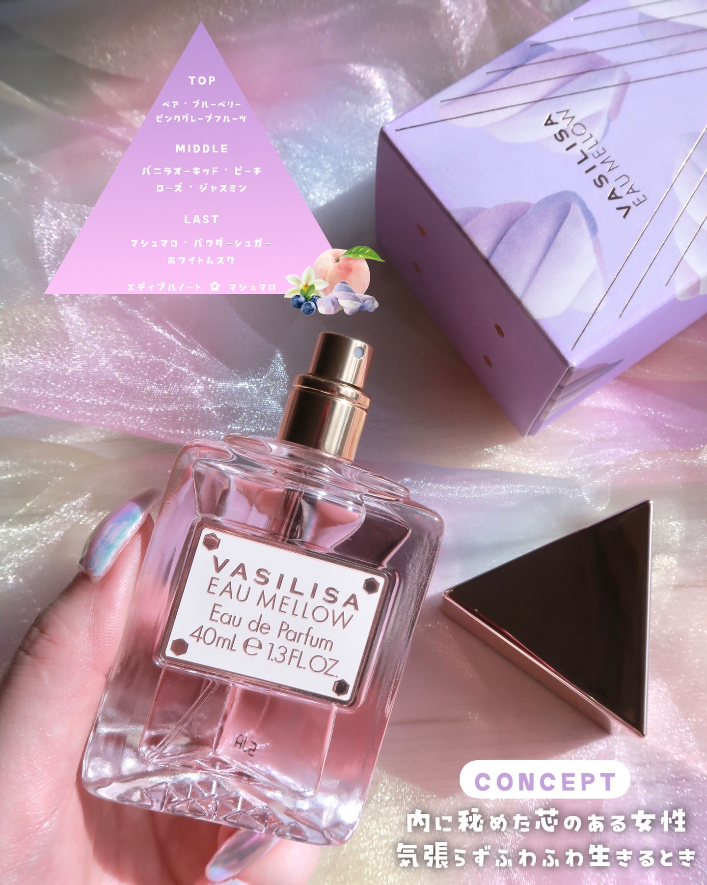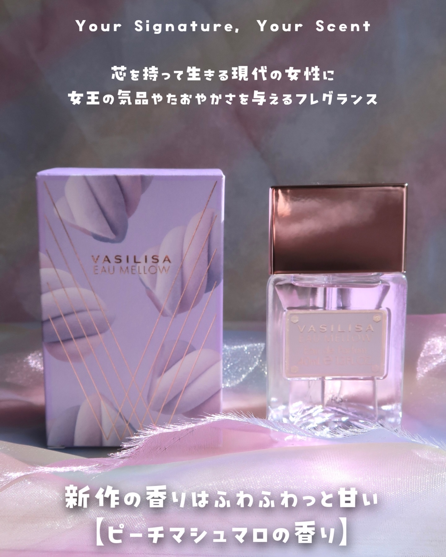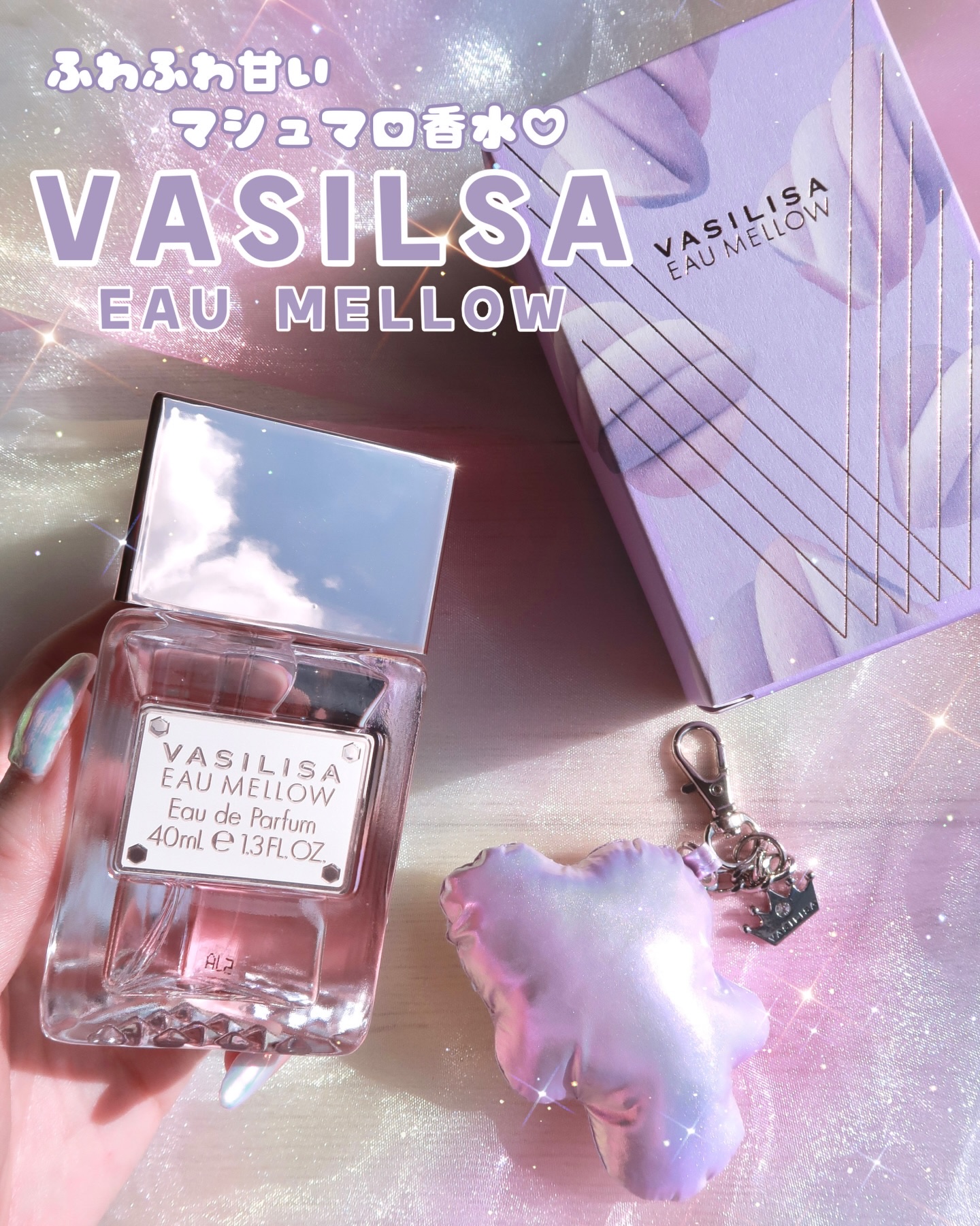 - 軽やかなパープルに包まれ、まっすぐな眼差しで“甘さと芯の強さ”を表現。 ふんわりマシュマロ香る新作「オー メロウ オードパルファム」が発売 キー香料は、ふんわり甘いマシュマロ。 ジューシーなピーチとブルーベリーに、バニラオーキッドがしなやかな芯を添えます。 フルーティな甘さがやわらかいマシュマロを感じさせる香りです。 ボトルデザインの基調となるのは、軽やかながらもどこか芯の強さや意思を感じさせるパープル。 「オー メロウ」のコンセプトである“内に秘めた、芯のある女性”を表現しています。 【初回数量限定パッケージ】 「オー メロウ」の発売を記念して、オリジナルチャーム付きの初回限定パッケージが登場。 パッケージには、雲のように浮かぶマシュマロを大胆にデザインしました。 付属のチャームは、キラキラとした雲型クッションに、VASILISA の刻印入り“女王の王冠”を添えた特別仕様です。 ※数量限定、なくなり次第終了 <40mL> 1月17日(土) 全国のバラエティショップ、ディスカウントストア等 オンラインストア「FITS you. STORE」 https://store.fits-japan.com/shop、楽天市場、Qoo10 等 <8mL> 1月17日(土) 全国のロフト、PLAZA、アインズ&トルペ(※一部店舗を除く) オンラインストア「FITS you. STORE」 https://store.fits-japan.com/shop 等 2月28日(土) 全国のバラエティショップ、ディスカウントストア等 一般発売に先立ち、1月7日(水)より@cosmeTOKYO 特設売り場にて先行発売を行うほか、FITS ONLINE STORE 楽天市場店にて先行予約を開始いたします。