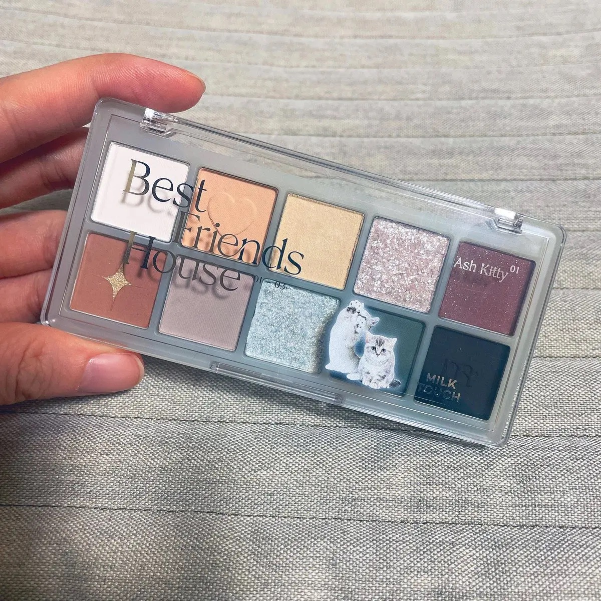 #提供むーんぱわーさろんのプレキャンでいただきました🎀milktouchビーマイベストフレンズハウスパレット01AshKitty🐈子猫ちゃんパケが可愛い⟡自分では選ばないようなカラーでメイクの幅広がりそう😽ザクザクラメも綺麗🩵黒アイシャドウ初...