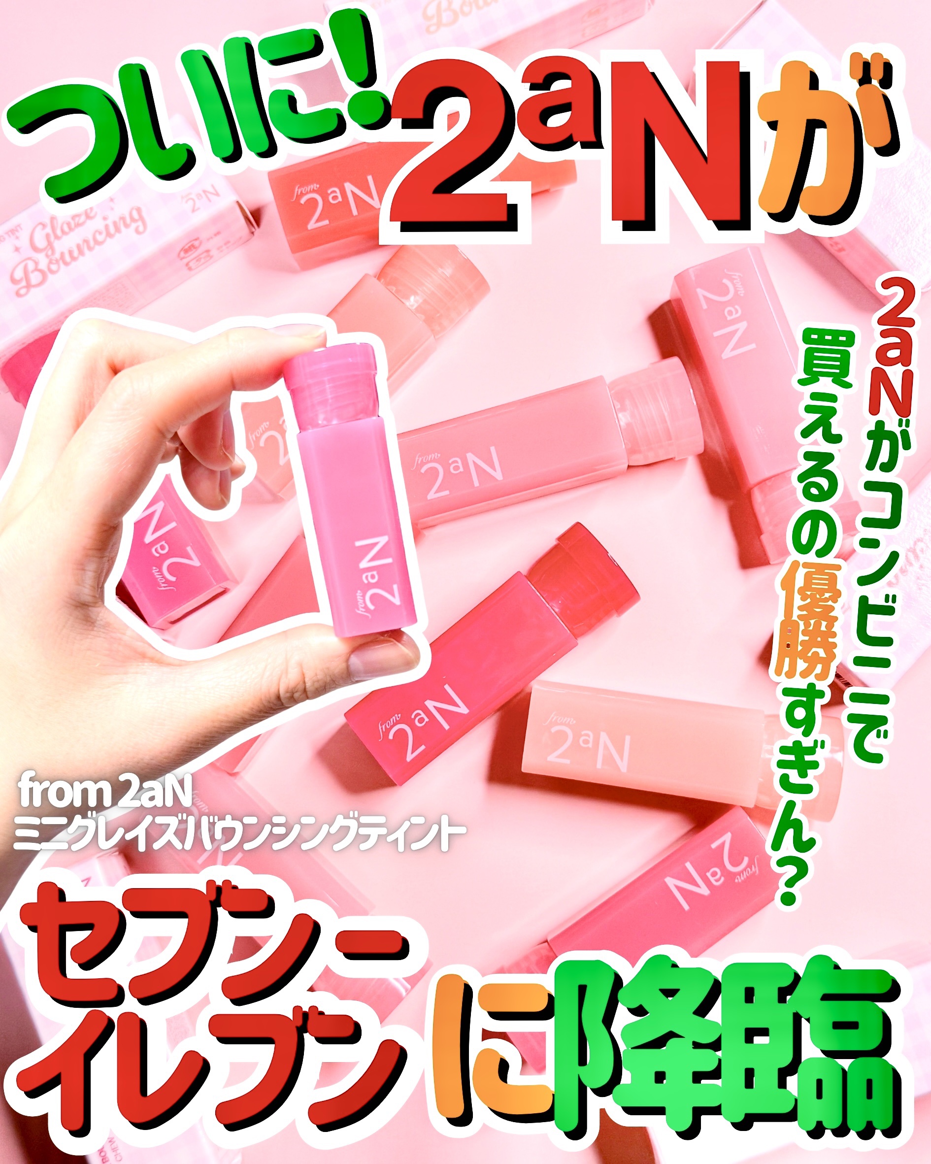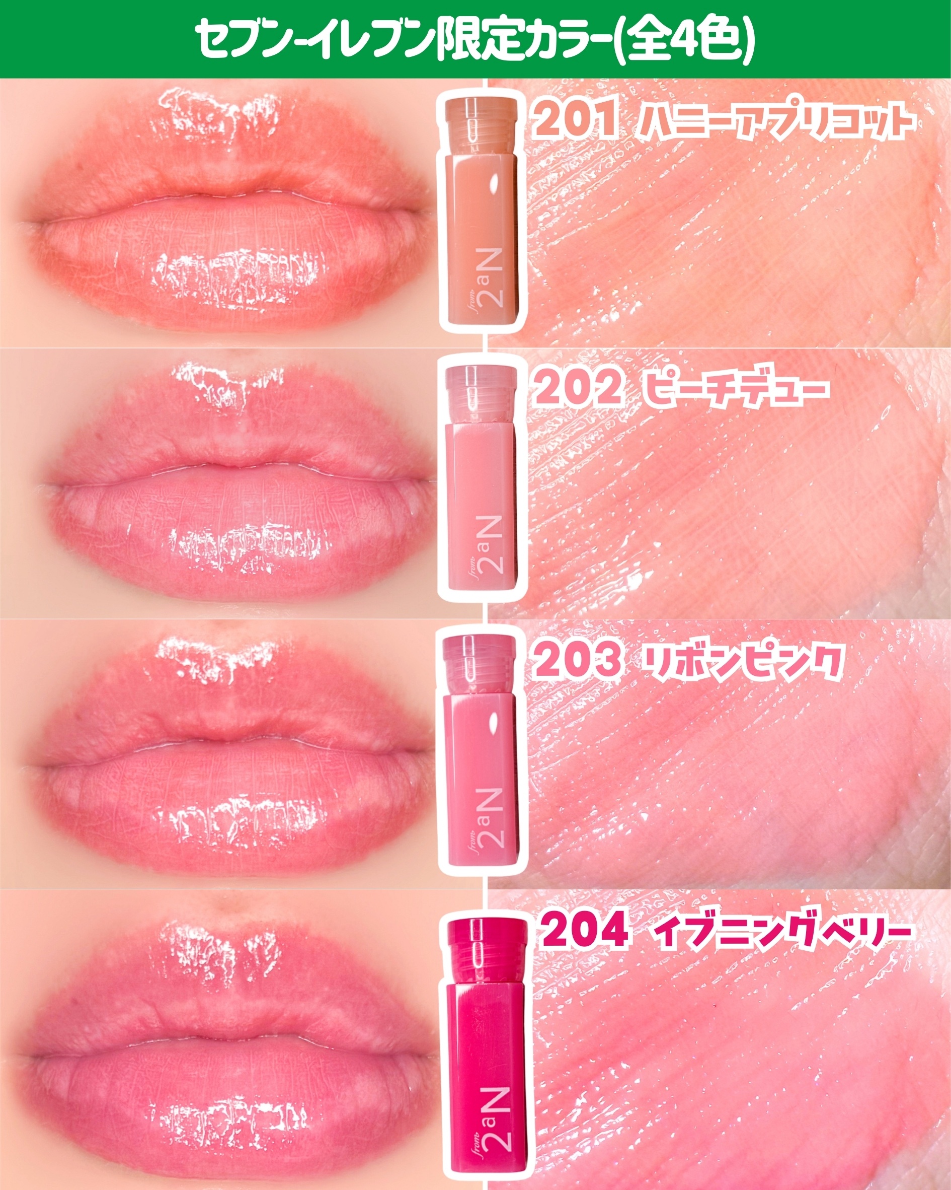 セブンイレブン限定🌟2aNの新ライン『from2aN』《ミニグレイズバウンシングティント》ガラスのようなツヤと透け感のある発色を楽しめる✨ミニサイズだけどチップの大きさは通常サイズと同じで塗りやすいよ👌🏻201〜204はセブンイレブン限定カラ...