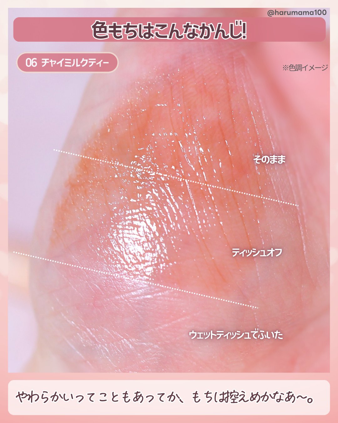 - <01 アプリコットティー> リンゴ酸ジイソステアリル、ダイマージリノール酸ダイマージリノレイルビス(ベヘニル/イソステアリル/フィトステリル)、ビスジグリセリルポリアシルアジペート-2、トリイソステアリン酸ポリグリセリル-2、水添ポリイソブテン、パラフィン、マイクロクリスタリンワックス、ウルシ果皮ロウ、ハチミツエキス、センチフォリアバラ花エキス、マンゴー果実エキス、カニナバラ果実エキス、アーモンド油、アルガニアスピノサ核油、アンズ核油、オリーブ果実油、シア脂、ツバキ種子油、ホホバ種子油、月見草油、BG、トリ(カプリル酸/カプリン酸)グリセリル、1,2-ヘキサンジオール、イソステアリン酸ソルビタン、酢酸トコフェロール、フェノキシエタノール、酸化鉄、酸化チタン、赤202、香料 <02 イチジクミルク> リンゴ酸ジイソステアリル、ダイマージリノール酸ダイマージリノレイルビス(ベヘニル/イソステアリル/フィトステリル)、ビスジグリセリルポリアシルアジペート-2、トリイソステアリン酸ポリグリセリル-2、水添ポリイソブテン、パラフィン、マイクロクリスタリンワックス、ウルシ果皮ロウ、ハチミツエキス、センチフォリアバラ花エキス、マンゴー果実エキス、カニナバラ果実エキス、アーモンド油、アルガニアスピノサ核油、シア脂、オリーブ果実油、アンズ核油、ツバキ種子油、ホホバ種子油、月見草油、BG、トリ(カプリル酸/カプリン酸)グリセリル、1,2-ヘキサンジオール、イソステアリン酸ソルビタン、酢酸トコフェロール、フェノキシエタノール、酸化鉄、酸化チタン、赤202、青1、香料 <03 ベリーヨーグルト> リンゴ酸ジイソステアリル、ダイマージリノール酸ダイマージリノレイルビス(ベヘニル/イソステアリル/フィトステリル)、ビスジグリセリルポリアシルアジペート-2、トリイソステアリン酸ポリグリセリル-2、水添ポリイソブテン、パラフィン、マイクロクリスタリンワックス、ウルシ果皮ロウ、ハチミツエキス、センチフォリアバラ花エキス、マンゴー果実エキス、カニナバラ果実エキス、アーモンド油、アルガニアスピノサ核油、シア脂、オリーブ果実油、アンズ核油、ツバキ種子油、ホホバ種子油、月見草油、BG、トリ(カプリル酸/カプリン酸)グリセリル、1,2-ヘキサンジオール、イソステアリン酸ソルビタン、酢酸トコフェロール、フェノキシエタノール、酸化鉄、酸化チタン、赤202、黄5、香料 <04 ザクロサワー> リンゴ酸ジイソステアリル、ダイマージリノール酸ダイマージリノレイルビス(ベヘニル/イソステアリル/フィトステリル)、ビスジグリセリルポリアシルアジペート-2、トリイソステアリン酸ポリグリセリル-2、水添ポリイソブテン、パラフィン、マイクロクリスタリンワックス、ウルシ果皮ロウ、ハチミツエキス、センチフォリアバラ花エキス、マンゴー果実エキス、カニナバラ果実エキス、アーモンド油、アルガニアスピノサ核油、シア脂、オリーブ果実油、アンズ核油、ツバキ種子油、ホホバ種子油、月見草油、BG、トリ(カプリル酸/カプリン酸)グリセリル、1,2-ヘキサンジオール、イソステアリン酸ソルビタン、酢酸トコフェロール、フェノキシエタノール、黄5、赤202、香料 <05 プラムワイン> リンゴ酸ジイソステアリル、ダイマージリノール酸ダイマージリノレイルビス(ベヘニル/イソステアリル/フィトステリル)、ビスジグリセリルポリアシルアジペート-2、トリイソステアリン酸ポリグリセリル-2、水添ポリイソブテン、パラフィン、マイクロクリスタリンワックス、ウルシ果皮ロウ、ハチミツエキス、センチフォリアバラ花エキス、マンゴー果実エキス、カニナバラ果実エキス、アーモンド油、アルガニアスピノサ核油、シア脂、オリーブ果実油、アンズ核油、ツバキ種子油、ホホバ種子油、月見草油、BG、トリ(カプリル酸/カプリン酸)グリセリル、1,2-ヘキサンジオール、イソステアリン酸ソルビタン、酢酸トコフェロール、フェノキシエタノール、酸化鉄、赤202、青1、香料 <06 チャイミルクティー> リンゴ酸ジイソステアリル、ダイマージリノール酸ダイマージリノレイルビス(ベヘニル/イソステアリル/フィトステリル)、ビスジグリセリルポリアシルアジペート-2、トリイソステアリン酸ポリグリセリル-2、水添ポリイソブテン、パラフィン、マイクロクリスタリンワックス、ハチミツエキス、センチフォリアバラ花エキス、マンゴー果実エキス、カニナバラ果実エキス、アーモンド油、アルガニアスピノサ核油、シア脂、オリーブ果実油、アンズ核油、ツバキ種子油、ホホバ種子油、月見草油、BG、トリ(カプリル酸/カプリン酸)グリセリル、水、1,2-ヘキサンジオール、イソステアリン酸ソルビタン、BHT、酢酸トコフェロール、フェノキシエタノール、酸化チタン、酸化鉄、香料 <21 ダーティチョコ> リンゴ酸ジイソステアリル、ダイマージリノール酸ダイマージリノレイルビス(ベヘニル/イソステアリル/フィトステリル)、ビスジグリセリルポリアシル