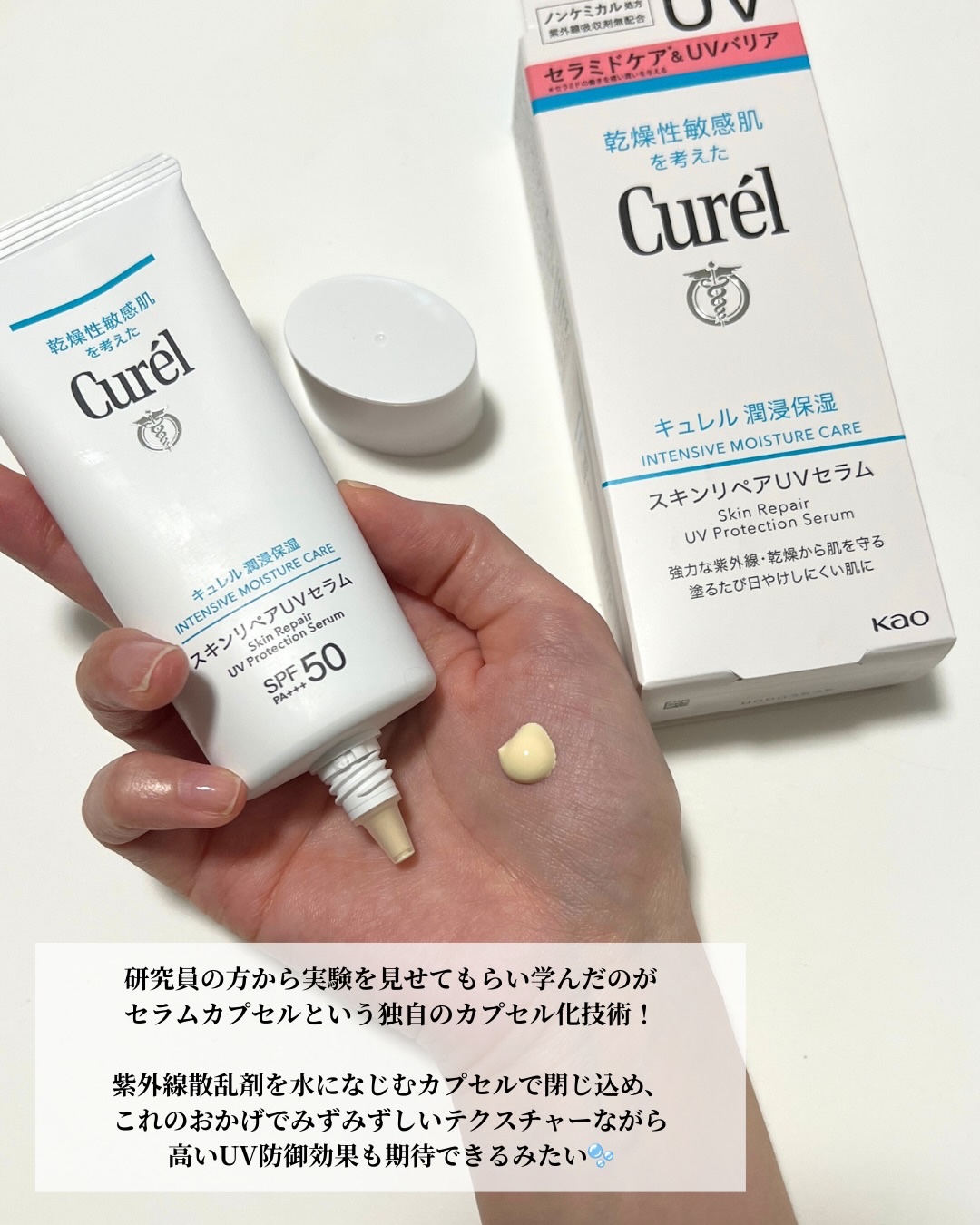 - 【敏感肌用】 セラミドケア*3&UVバリア処方で、強力な紫外線や乾燥から肌を守り、 塗るたびに日やけしにくい肌に。SPF50 PA+++。 ノンケミカル処方(紫外線吸収剤無配合)の日やけ止め ● セラミド機能成分*9配合 角層の潤いを保つバリア機能の働きを補い、潤いを与える ● 微細なUVカット成分を包み込んだセラムカプセルが盾となり、強力な紫外線から肌を守り抜く ● 潤い成分(セラミド機能成分*9、ユーカリエキス、アスナロエキス)配合。 もっちりと潤った肌に ● 負担感なく、しっとりと肌に密着するセラムタイプ ● 化粧下地としても ● 洗浄料で落とせる ● 赤ちゃんのデリケートな肌にも使える ● 顔・からだ用 ● SPF50 PA+++ *3 セラミドの働きを補い、潤いを与える *9 セチルPGヒドロキシエチルパルミタミド(保湿) <乾燥性敏感肌を考えた低刺激設計> ● ノンケミカルUV(紫外線吸収剤無配合) ● 無香料 ● アルコールフリー(エチルアルコール無添加) ● アレルギーテスト済み※ ● 乾燥性敏感肌の方の協力によるパッチテスト済み※ [パッチテスト:皮膚に対する刺激性を確認するテストです] ● にきびのもとになりにくい処方 ノンコメドジェニックテスト済み※ ※すべての方にアレルギーや皮膚刺激が起こらない、コメド(にきびのもと)ができないというわけではありません。 商品に関するお問い合わせ 受付時間9:00~17:00(土曜・日曜・祝日除く) *製品の誤飲・誤食など緊急の場合は、受付時間外でもお電話ください キュレル:0120-165-698