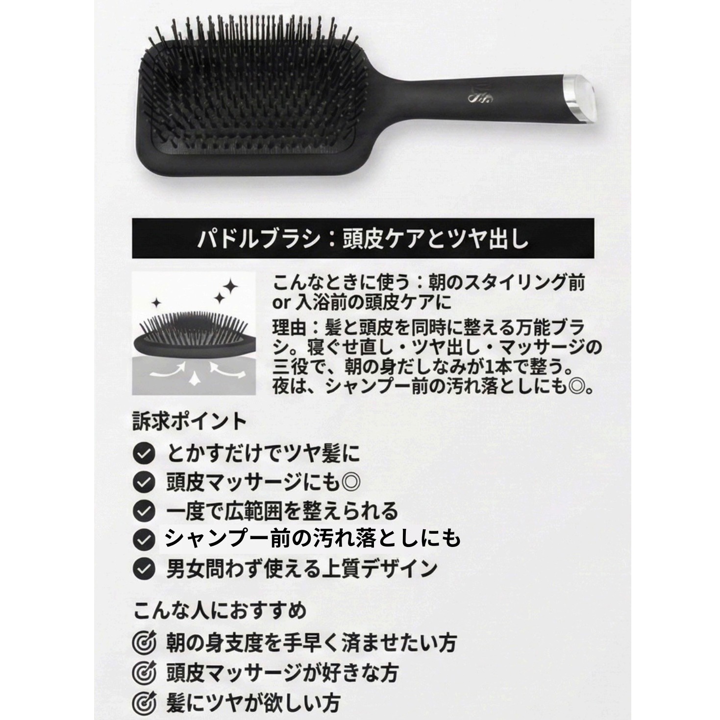 - 広いクッション面が頭皮をやさしい使い心地で刺激。髪の流れを整えながら摩擦を抑え、ツヤとまとまりを守ります。 夜のリラックスタイムにも、朝のスタイリング前にも使えます。 髪と頭皮を整える、癒しの時間を。