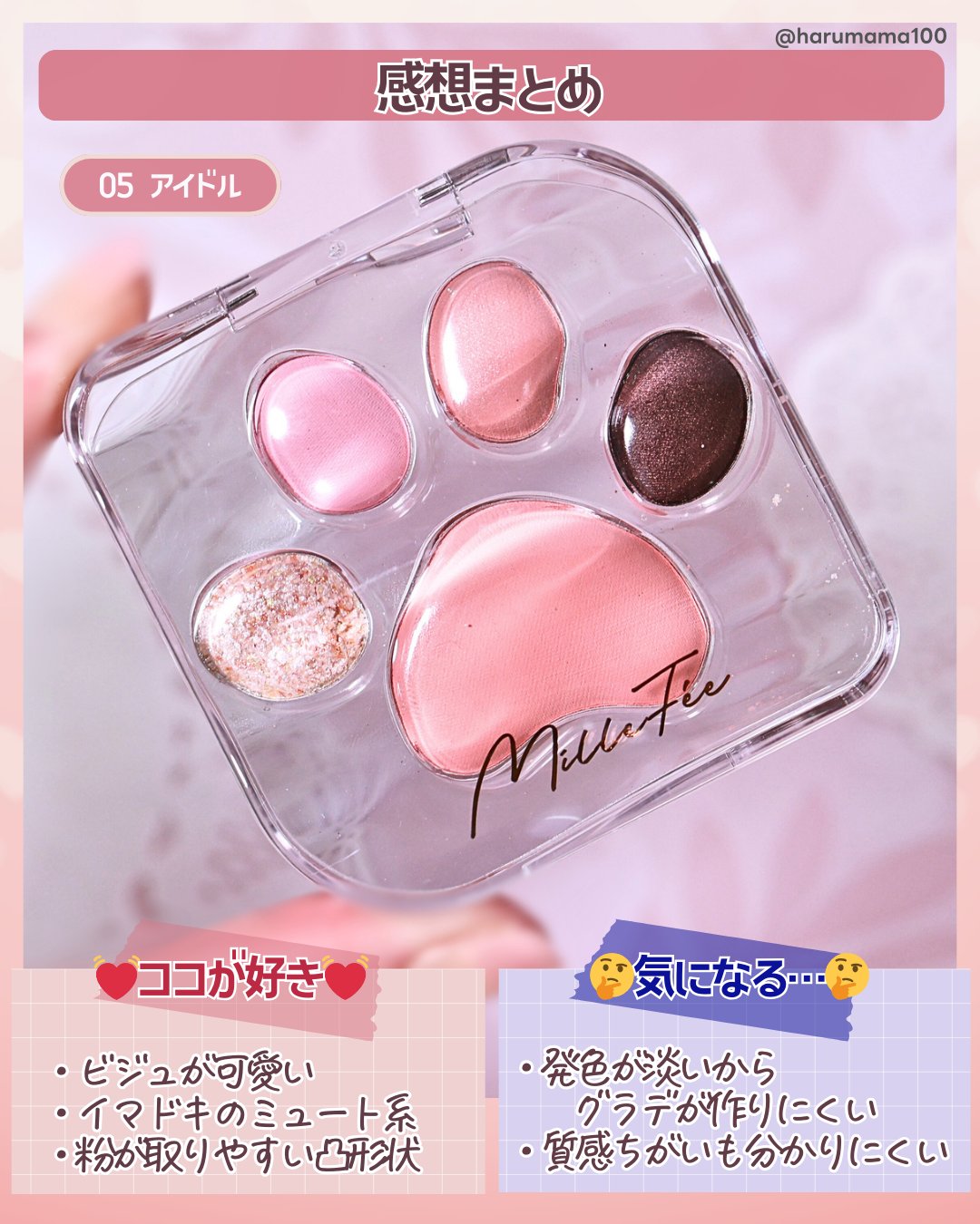 🎀肉球アイパレット🐾🎀MilleFéeミャオパウズアイシャドウパレット05アイドルゆもあはイエベ春で、05番を使いました!他のパーソナルカラーの方のおすすめ↓↓↓イエベ春05アイドルブルベ夏01甘えんぼイエべ秋04気まぐれブルベ冬06思わせぶ...
