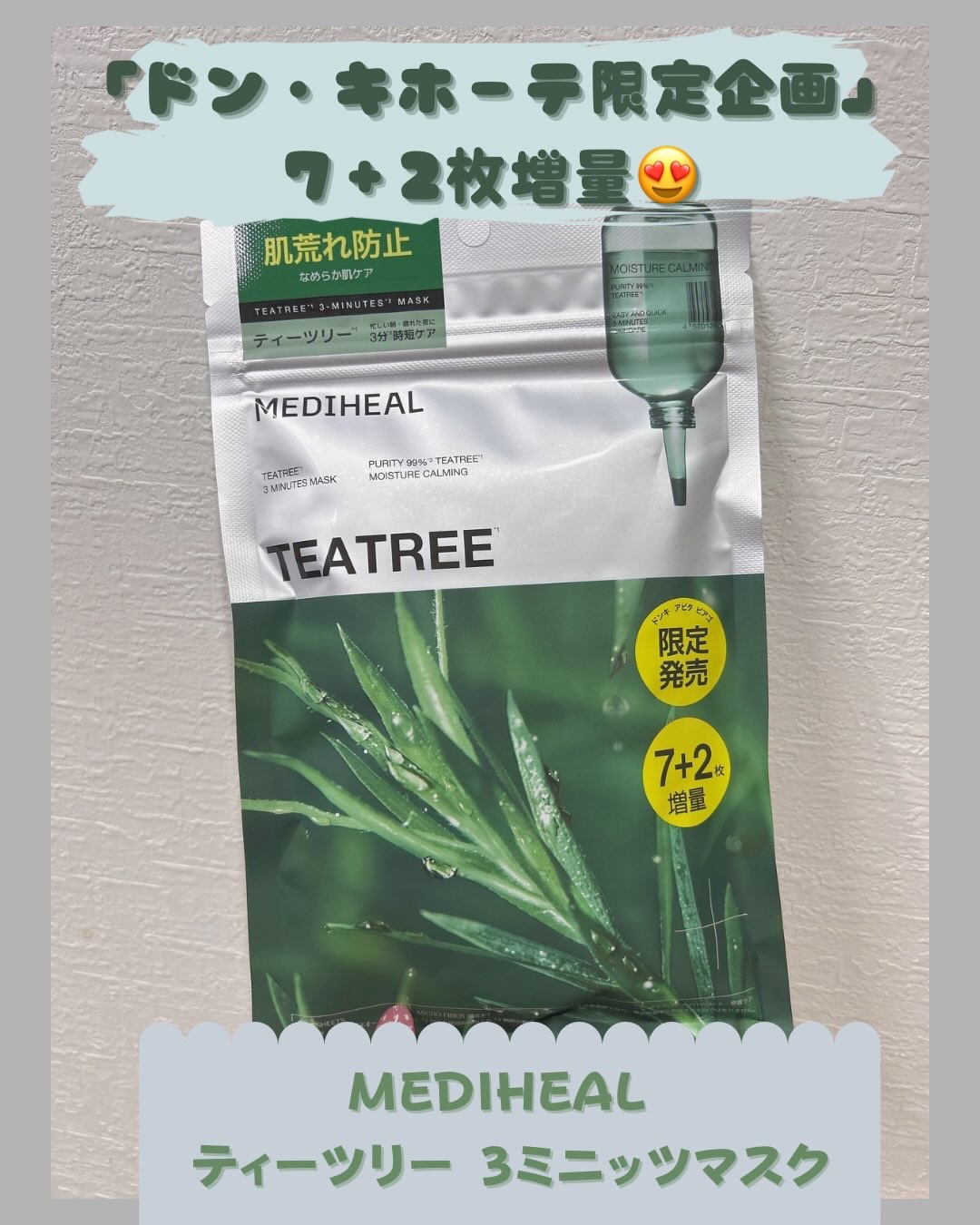 @mediheal_jp✼••••✼MEDIHEALティーツリー3ミニッツマスク「ドン・キホーテ限定企画」✼••••✼ドン・キホーテ限定企画‼️3ミニッツマスク(増量版)です💚人気の「ティーツリー3ミニッツマスク」が、ドン・キホーテでしか手に...