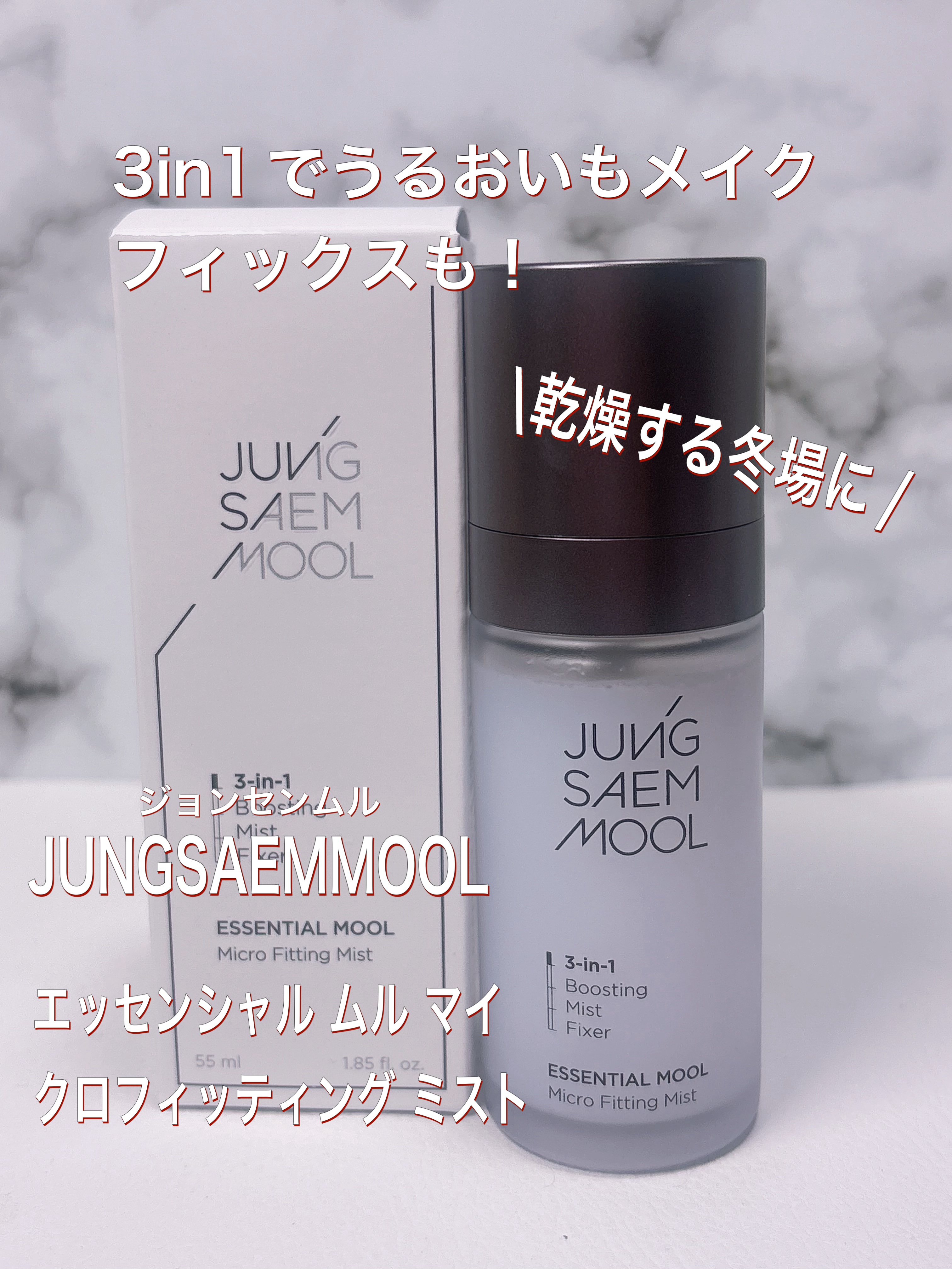 JUNGSAEMMOOL(ジョンセンムル)エッセンシャルムルマイクロフィッティングミスト嬉しい3in1♪メイク前の肌ブースト+乾燥時のうるおい補給ミスト+メイク後の軽やかなフィクサー粒子が細くてピタっと密着してくれるミストです。水分感たっぷり...