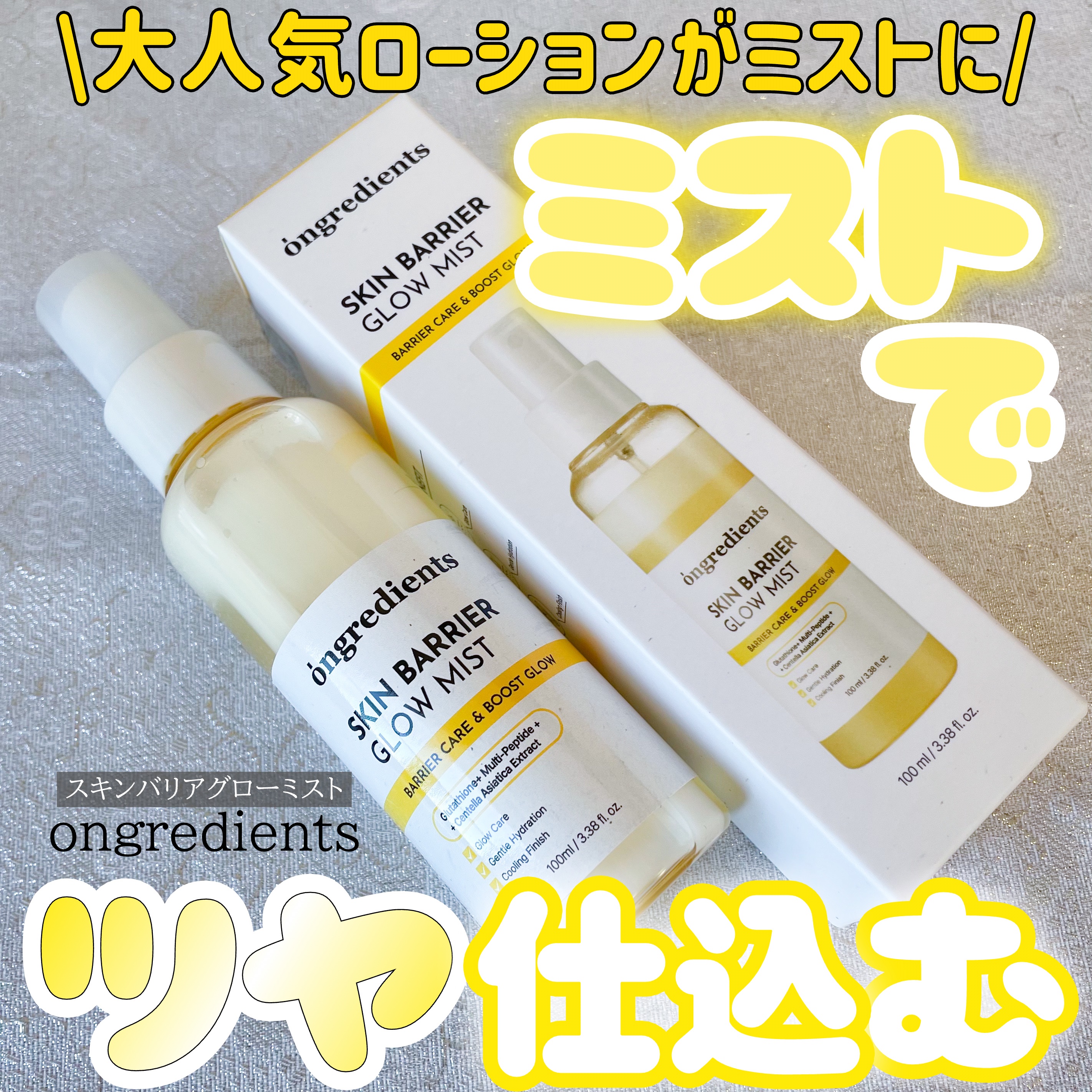- 「ongredients(オングリディエンツ)」が、ついに日本のオフライン店舗に登場! <2025年8月30日(土)(*1)より全国のプラザ、ドン・キホーテ(*2)にて先行販売を開始> 水光トナーと水分グロウ(ツヤ)成分が融合し、まるでハイライトを施したようなツヤ肌ミストを実現 【主要成分】 ・ツボクサ葉エキス(*3) 乾燥などの外的刺激を受けた肌を整え、肌バリア(*4)機能を守ります。 ・複合ペプチド(*5) 肌のコンディションを整え、ハリのある肌印象へと導きます。 ・ヒアルロン酸(*6)&パンテノール(*7) 乾燥した肌を保湿ししっとり健やかに保ちます。 【こんな方におすすめ】 ・外的刺激により乾燥で肌がゆらぐのが気になる方 ・保湿とキメのダブルケアをしたい方 ・メイクの上からでも!外出先でも、肌にうるおいを与えたい方 (*1)店頭開始日となり、購入可能日は各店舗により異なります。 (*2)一部店舗を除きます。 (*3)整肌成分 (*4)角質層のうるおいを保つこと (*5)トリペプチド-1銅,トリペプチド-1,パルミトイルトリペプチド-1,パルミトイルペンタペプチド-4,ヘキサペプチド-11,ヘキサペプチド-9 (*6)ヒアルロン酸Na,ヒアルロン酸クロスポリマーNa,ヒアルロン酸K,ヒアルロン酸ヒドロキシプロピルトリモニウム,加水分解ヒアルロン酸Na,加水分解ヒアルロン酸,ヒアルロン酸(保湿成分) (*7)保湿成分