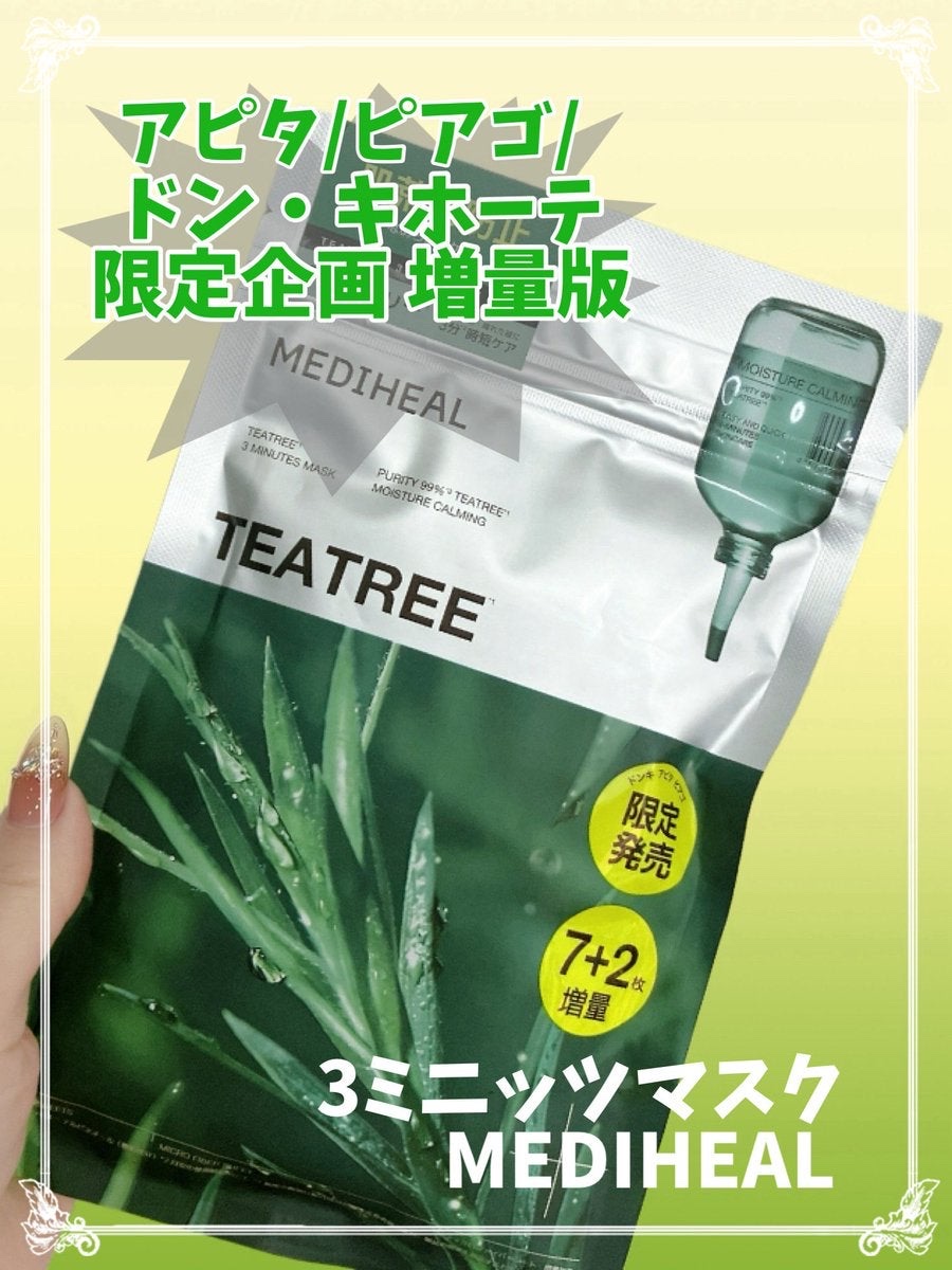 𓆸MEDIHEALティーツリー3ミニッツマスク\ドン・キホーテ限定企画!/人気の「ティーツリー3ミニッツマスク」が、ドン・キホーテ限定企画で、通常7枚入りが2枚プラスの限定9枚入り仕様でさらにお得に♡『3ミニッツマスク』はたった3分で、乾燥・...